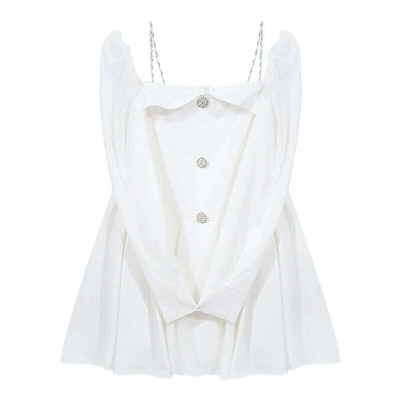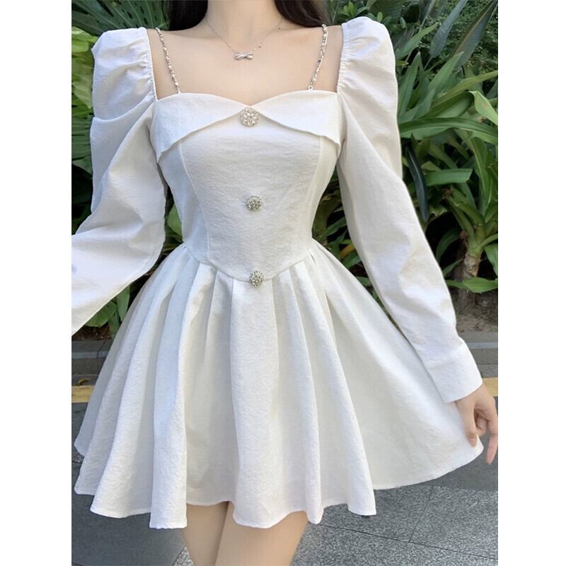 フレンチスタイルのニッチスクエアネックドレスの女性初秋の新しい長袖ウエストスリミングハイウエスト白いショートスカート ロング ホワイト オータム 秋物 スクウェア nana79344401894 | modepoisson