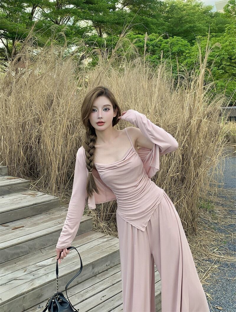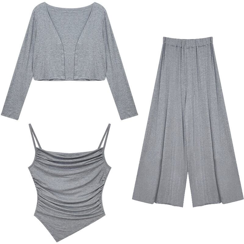 甘いサスペンダー長袖日焼け止めカーディガンスーツ女性のハイウエストワイドレッグパンツ秋 2023 新しいファッション 3 点セット ロング 大人ガーリー スウィート キュート カジュアル オータム 秋物 nana83224372942 | modepoisson