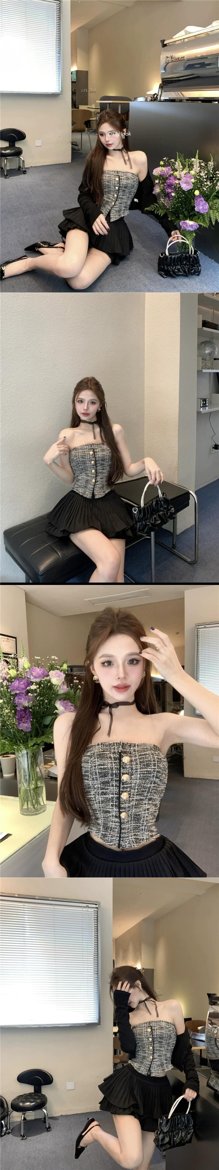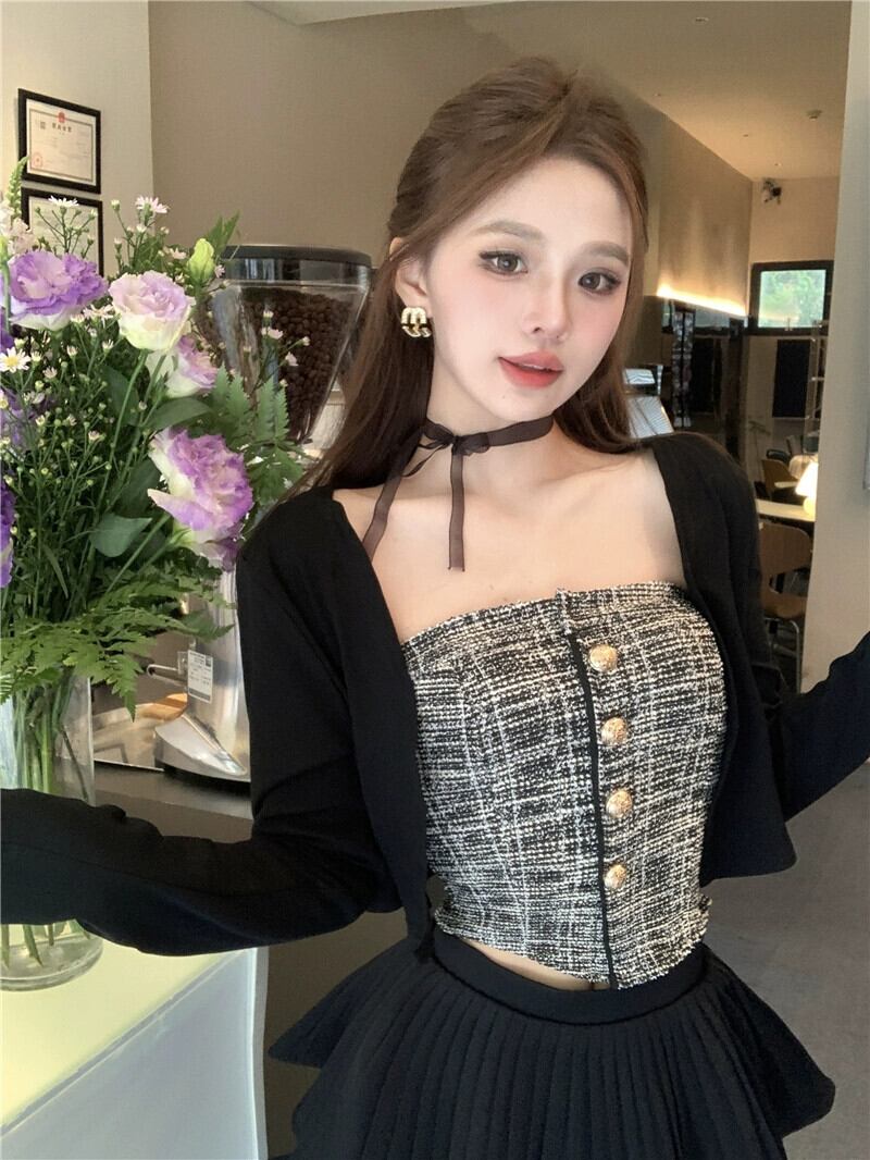 Hotの小さな香りのスタイルのチューブトップカーディガンハイウエストプリーツハーフパンツスカート女性の初秋の気質スリーピーススーツスカート ハイウェスト オータム 秋物 nana28666168696 | modepoisson