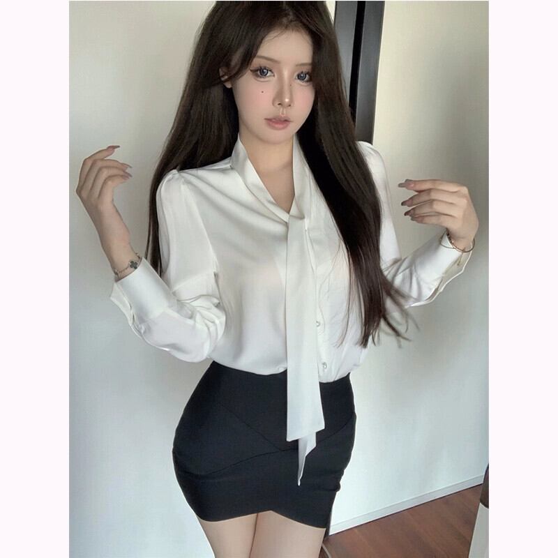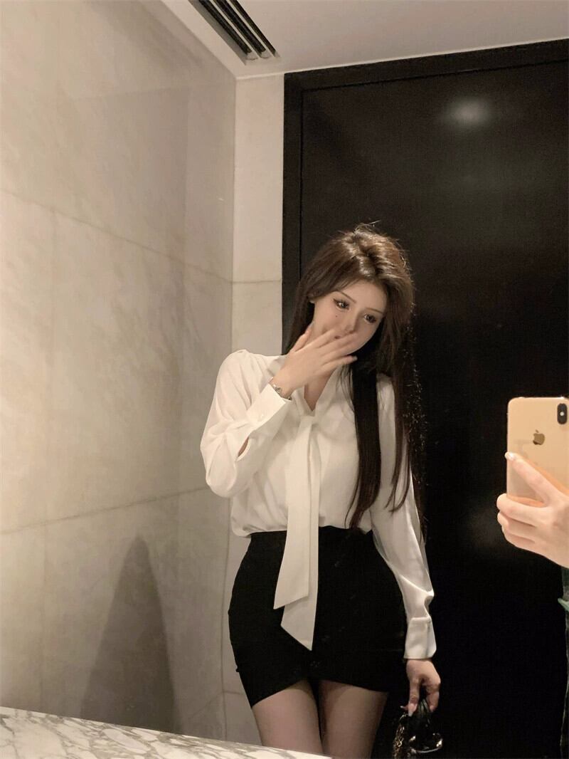 色:グレーブルーシャツ,白のシャツ,グレーのバッグヒップスカート,ブラックバッグヒップスカート