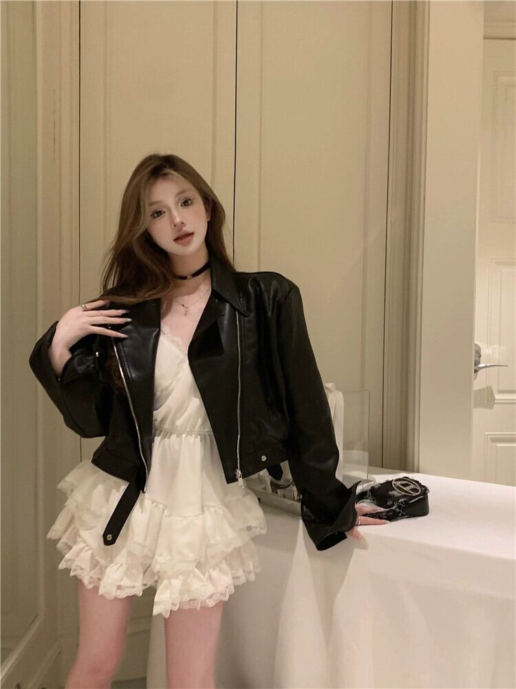甘いハイエンドサスペンダードレスの女性の初秋オートバイレザージャケットアウターファッショナブルな気質ツーピーススーツ 大人ガーリー スウィート キュート カジュアル オータム 秋物 nana84486316195 | modepoisson