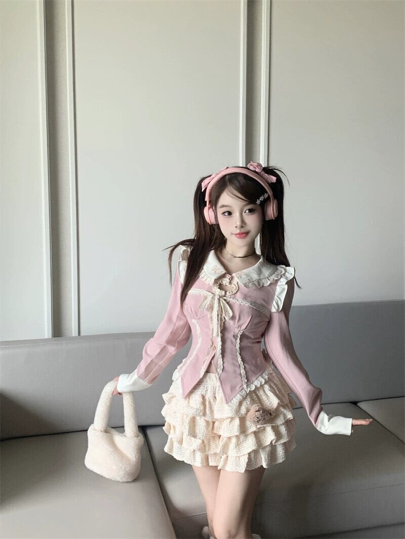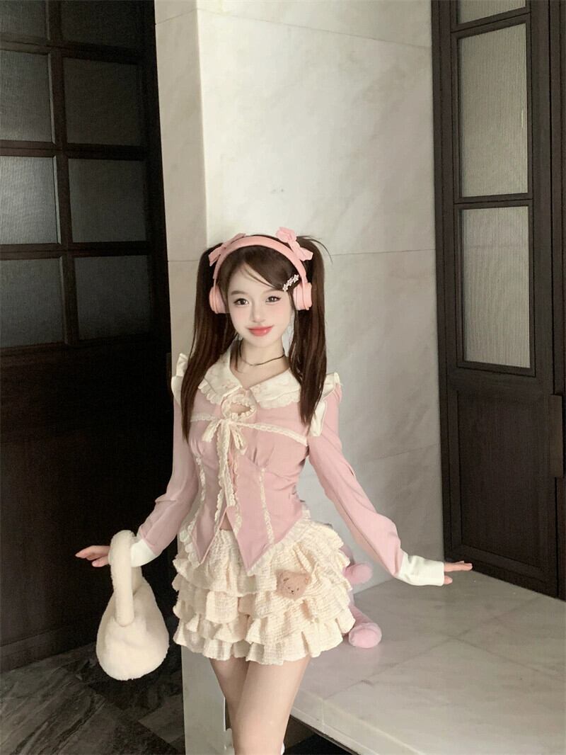 色:ピンクのアプリコットのパッチワークシャツ,アプリコットケーキスカート(クマ付き)