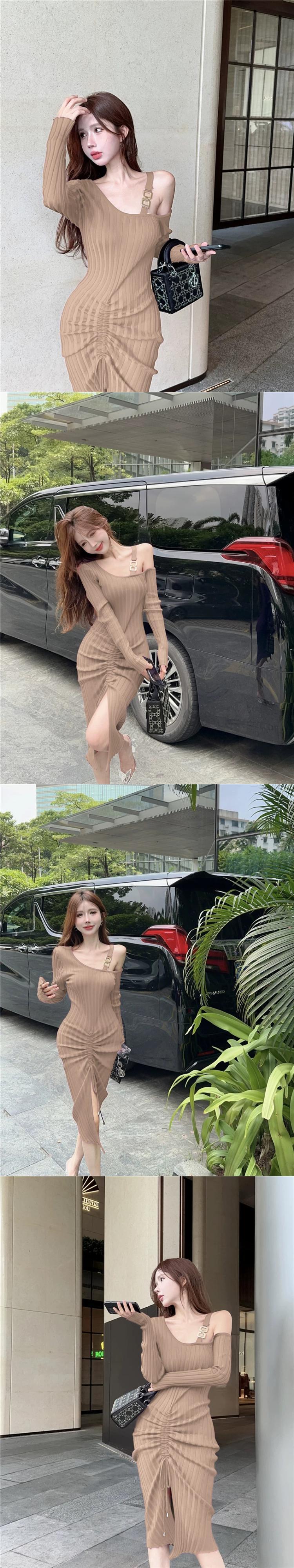 セクシーなお尻カバーニットドレス女性 2023 秋と冬の新ハイエンドロングスカートウエスト痩身長袖スリットスカート オータム 秋物 ウィンター 冬物 nana60488909922 | modepoisson