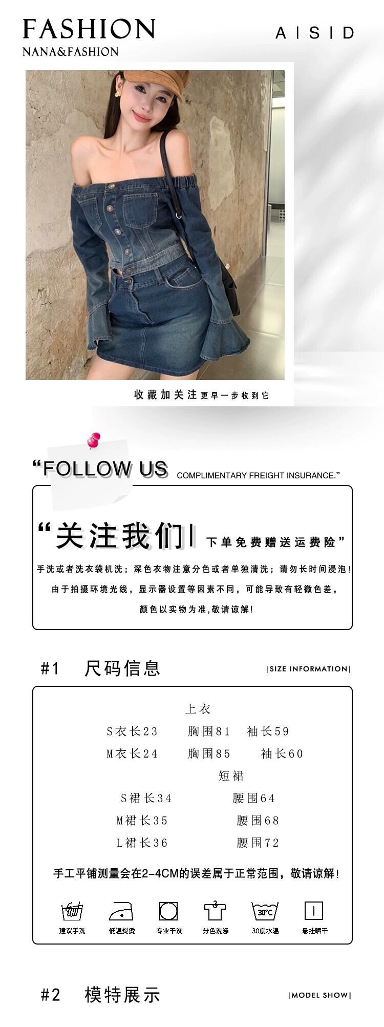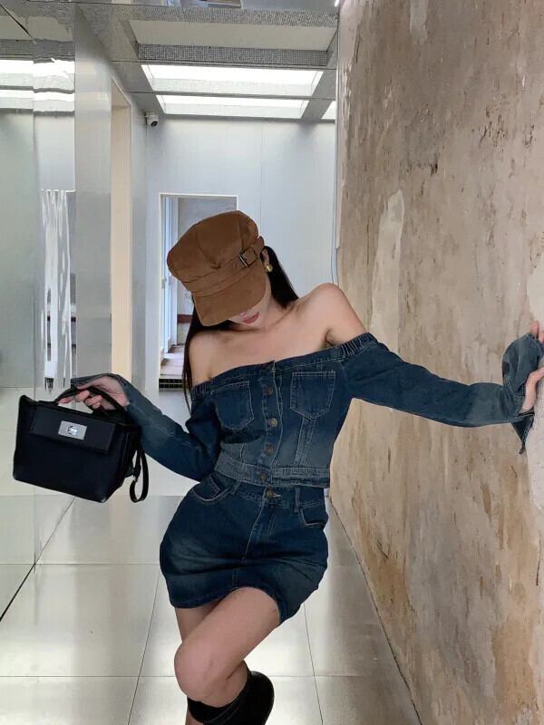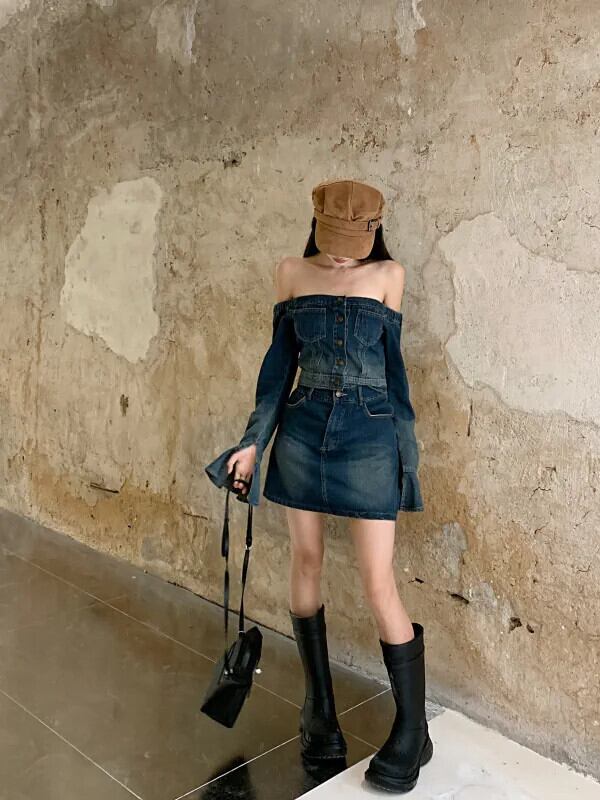 フランスの純粋な欲望スタイルのスーツの女性初秋ワンショルダーデニムトップハイウエスト半身ヒップカバースカート 2 点セット オータム 秋物 ピュア nana12725627440 | modepoisson
