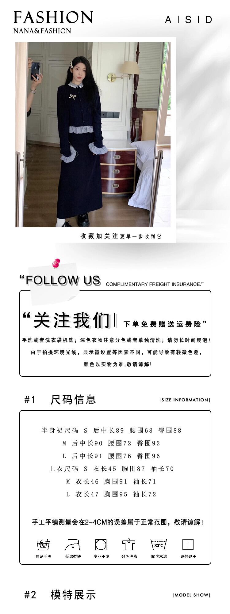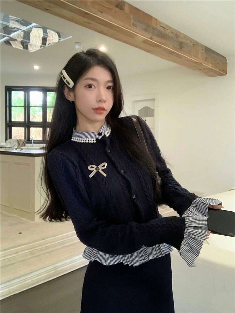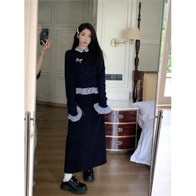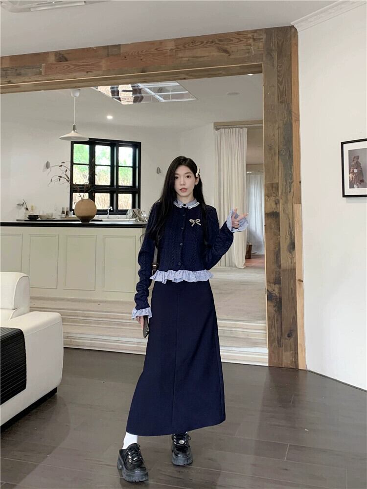 色:ネイビーブルーのスカート,フェイクツーピースセーター+ブローチ