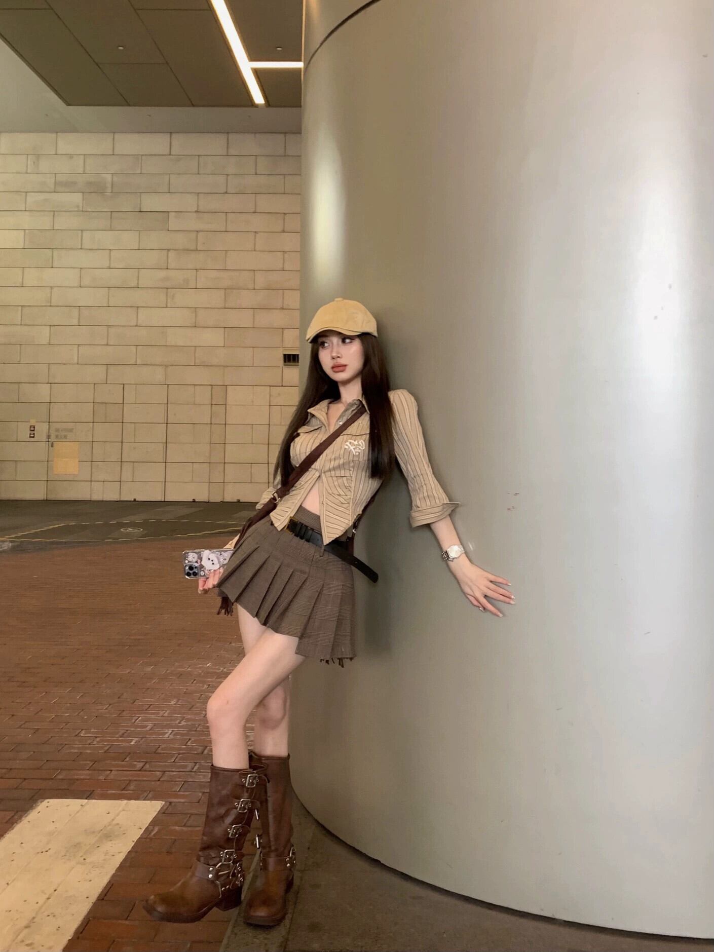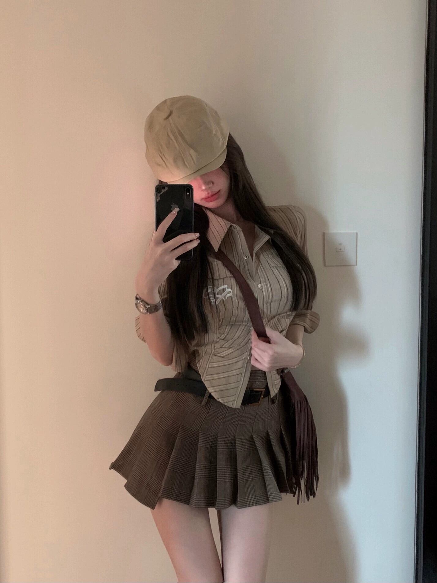 アメリカの縞模様のシャツ、レトロな五分丈スカート、おしゃれなツーピーススーツの女性、初秋の新しいスタイル、今年の人気スーツ オータム 秋物 ストライプ nana18269570975 | modepoisson