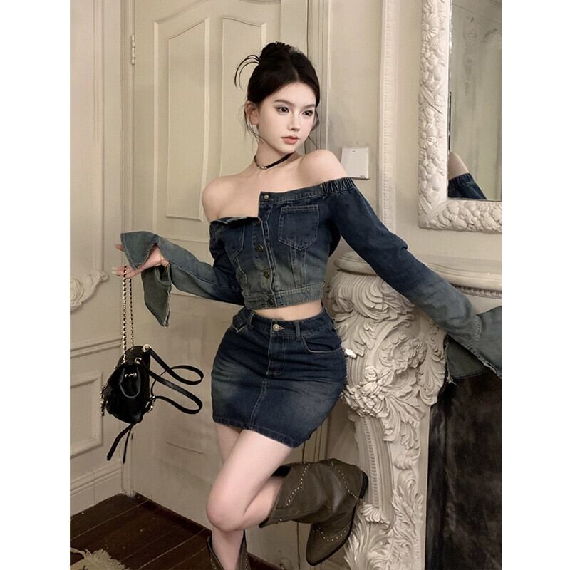 ホットワンショルダースリムデニム長袖トップヒップカバーハーフレングススカート爆発的なストリートスーツスカートツーピースセット女性初秋 ロング オータム 秋物 nana36142403326 | modepoisson