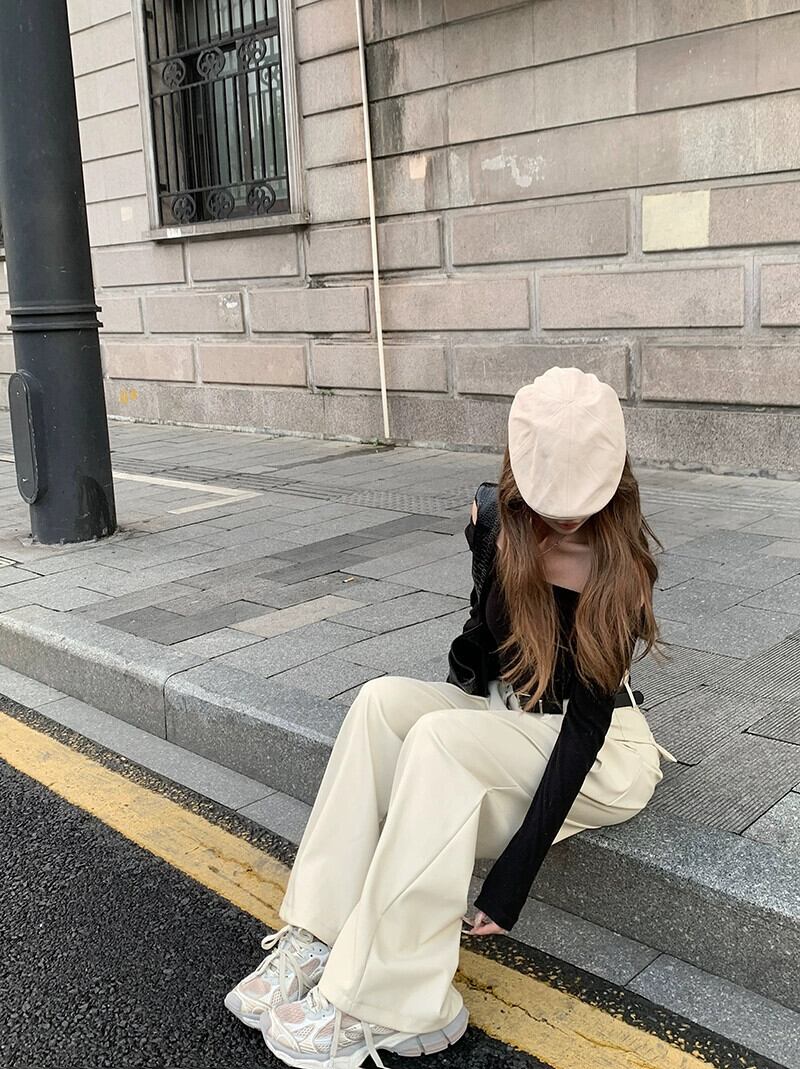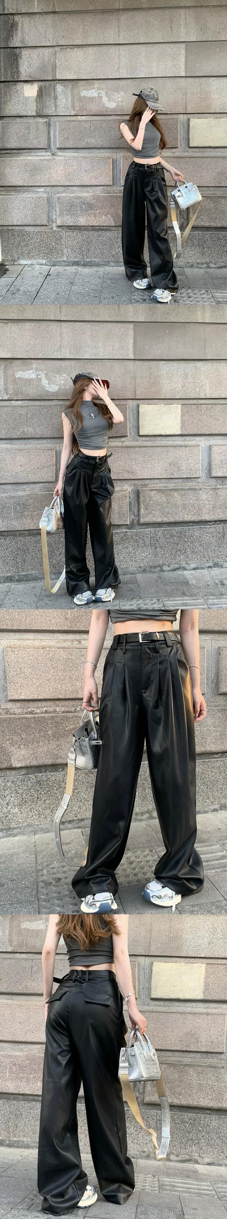 黒のワイドレッグパンツの女性の秋カジュアルハイエンドニッチ多用途ルーズハイウエストドレープワークウェアロングパンツレザーパンツ ブラック オータム 秋物 nana78807535195 | modepoisson