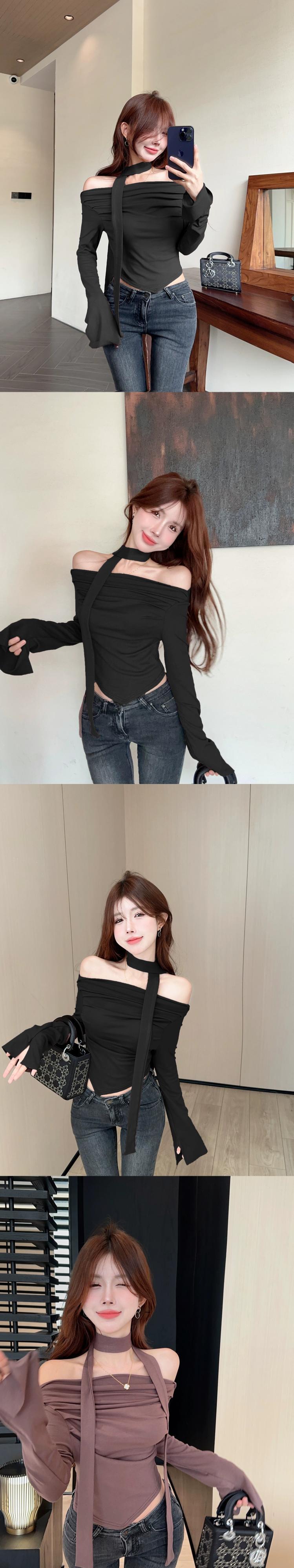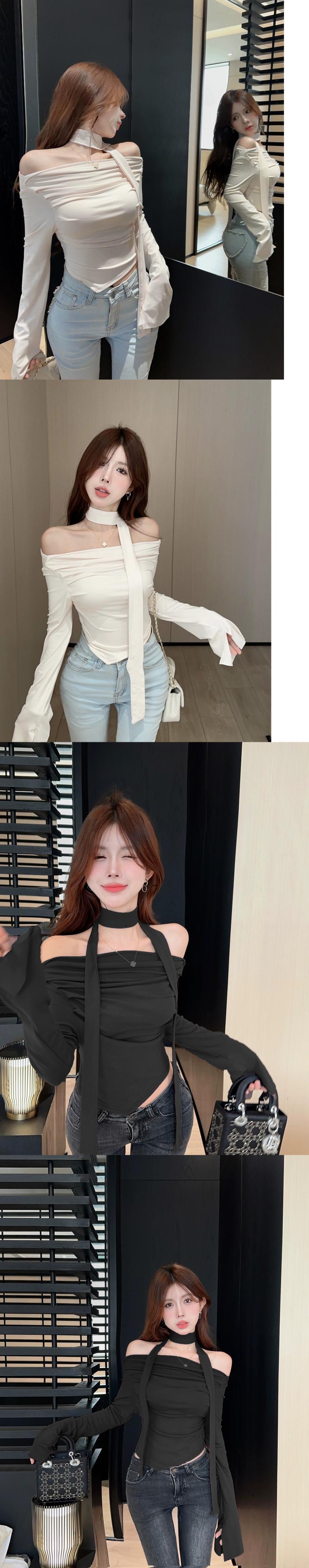 不規則なデザインの長袖 T シャツ甘いワンショルダー プリーツ ホルターネック ショート スリムフィット トップ女性秋 ロング 大人ガーリー スウィート キュート カジュアル オータム 秋物 Tシャツ nana19690973800 | modepoisson