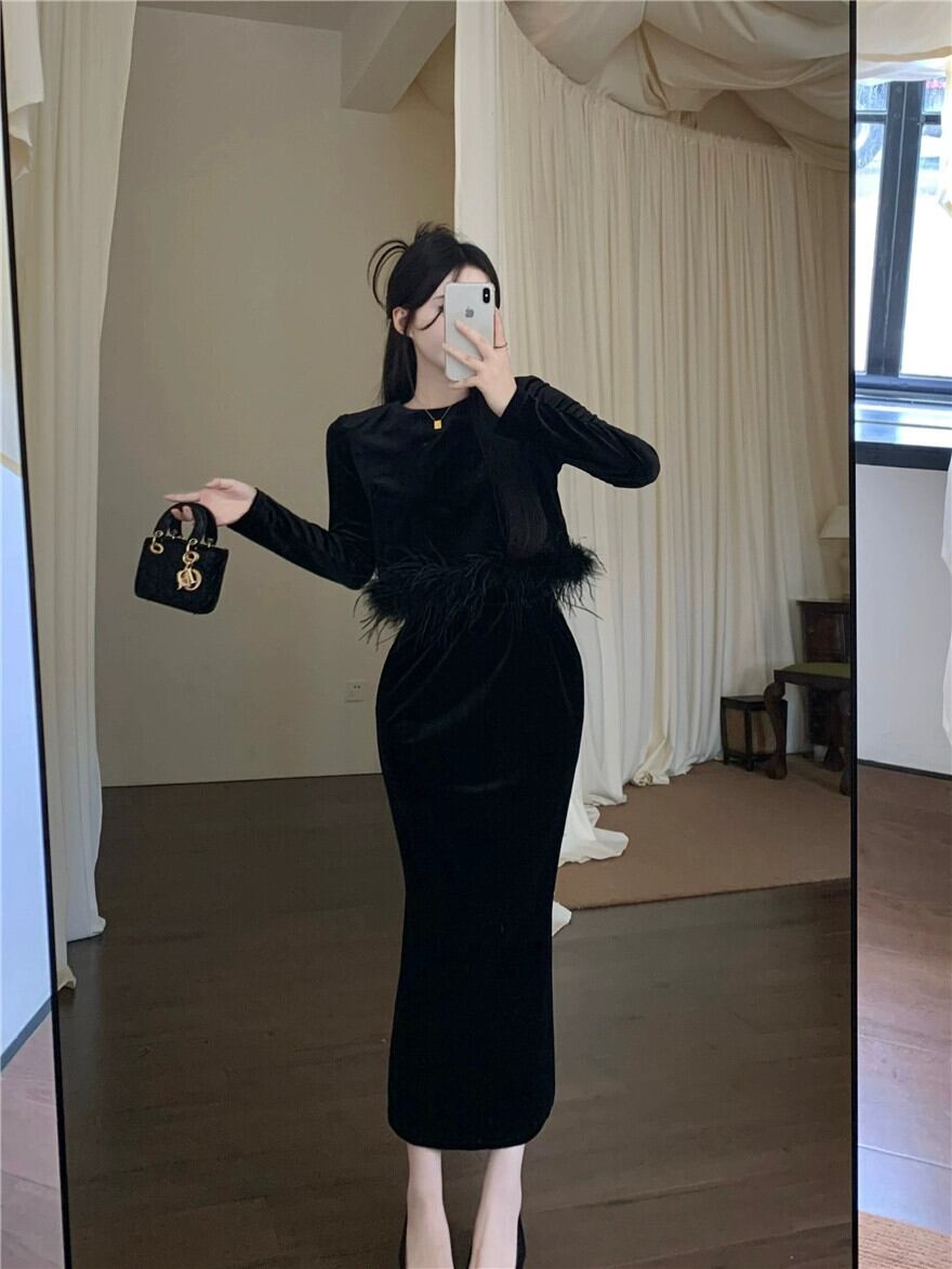 気質ベルベット長袖トップヨーロッパスタイルの美しいファッションスーツハーフレングススカートスリットロングスカート秋のツーピースセット女性 オータム 秋物 ヨーロピアン nana63588820954 | modepoisson