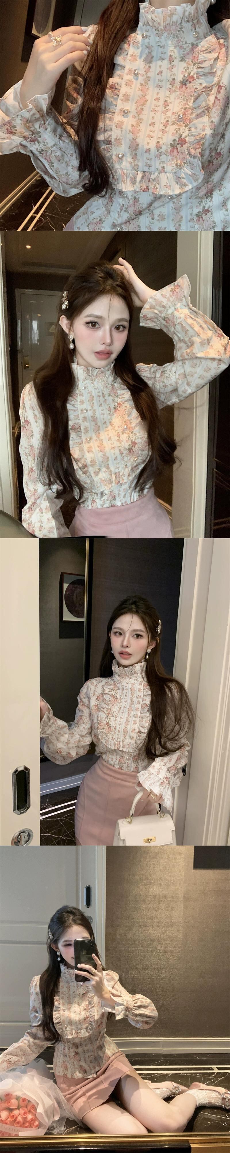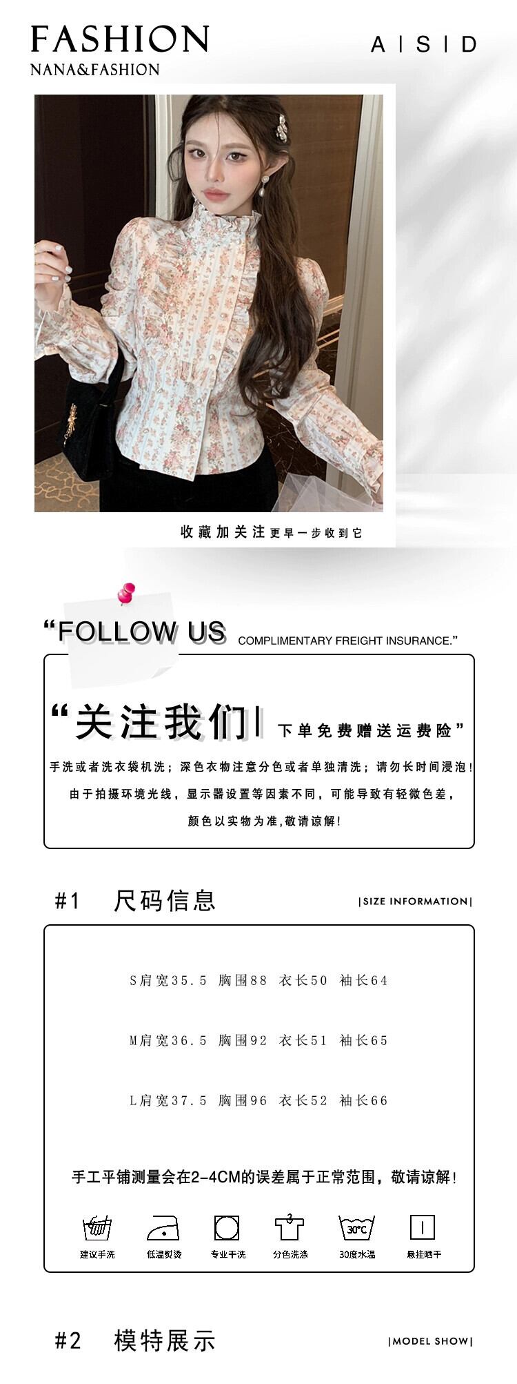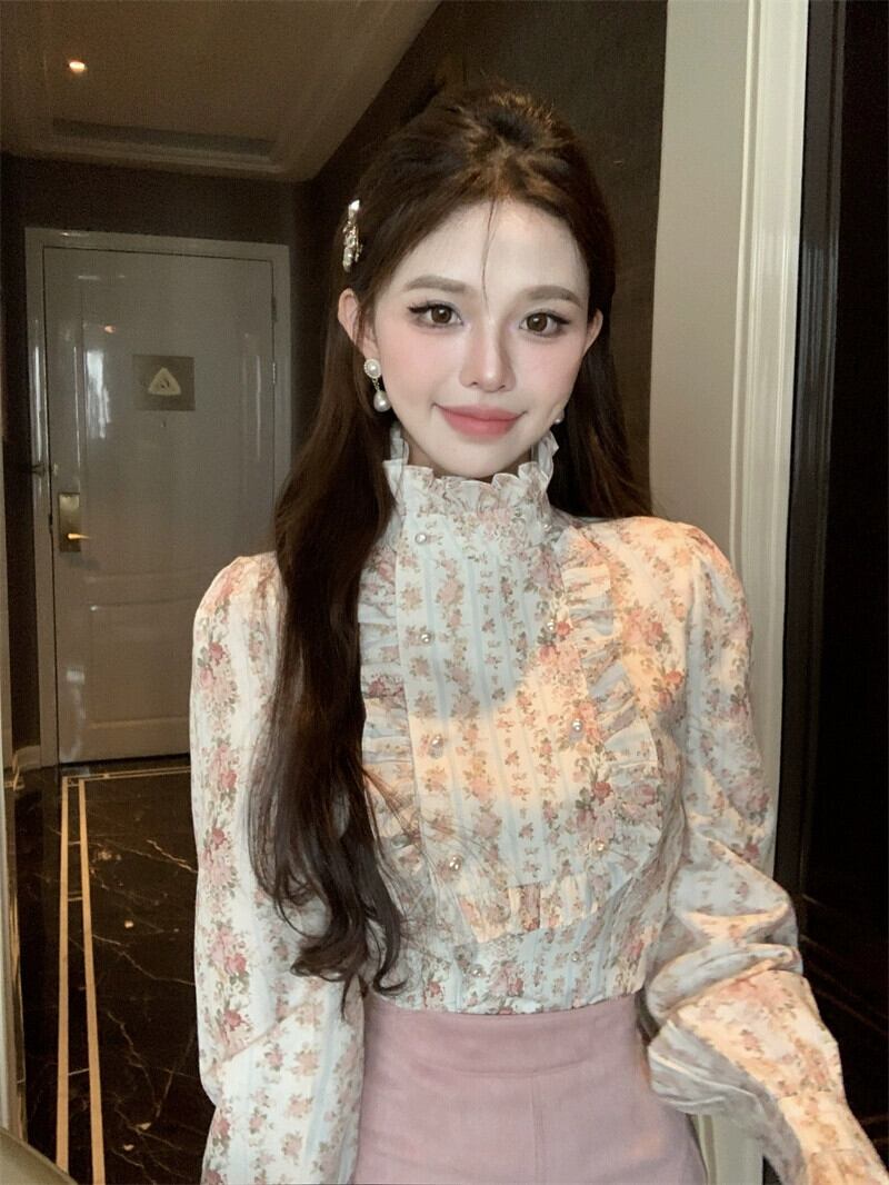 フレンチスイートシャツ プリント フリル スタンドカラーシャツ レディース 秋 優しい雰囲気 トップス 大人ガーリー スウィート キュート カジュアル オータム 秋物 nana91990605895 | modepoisson