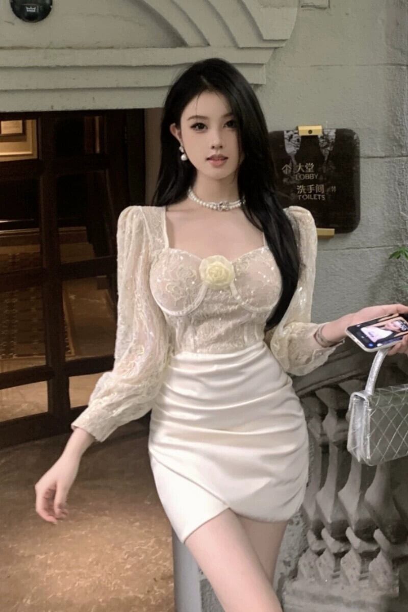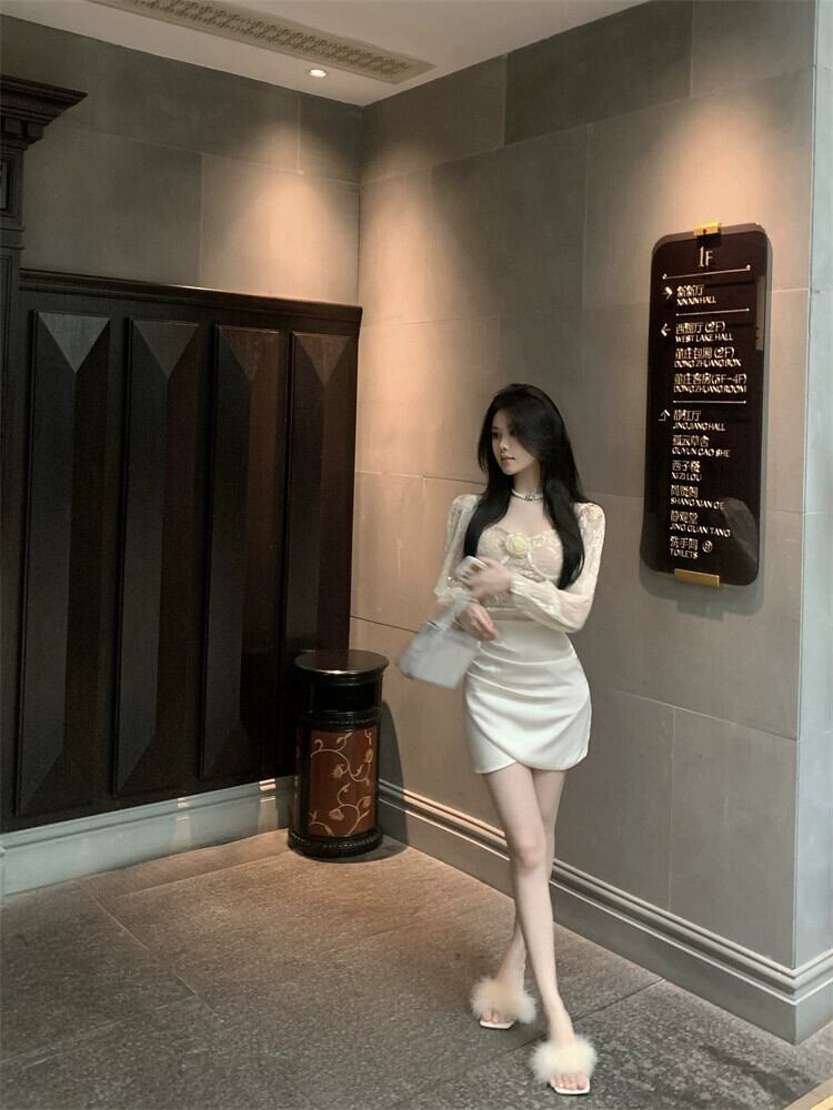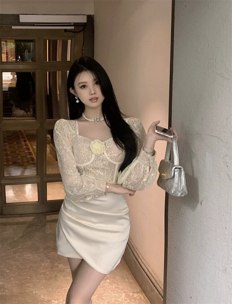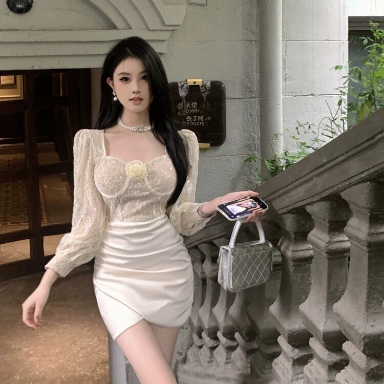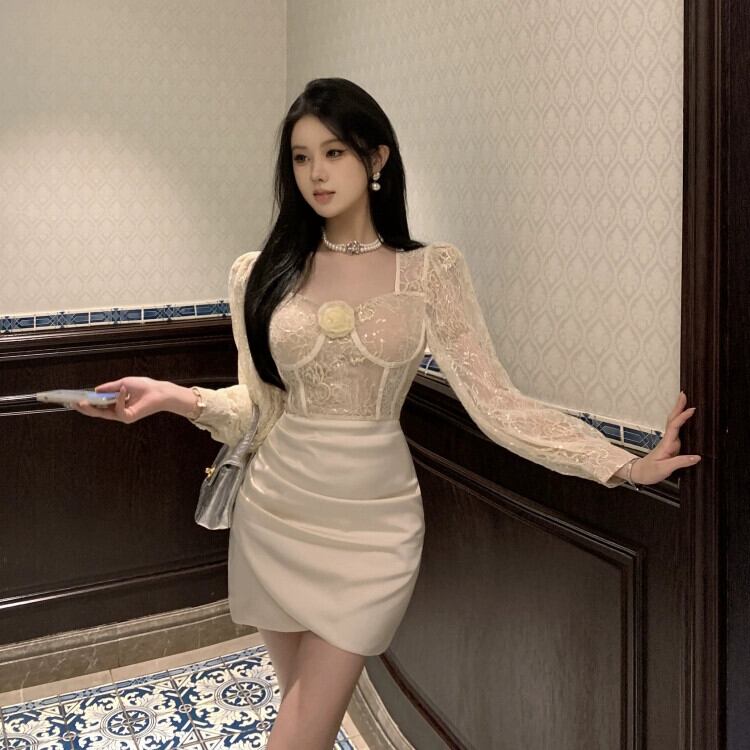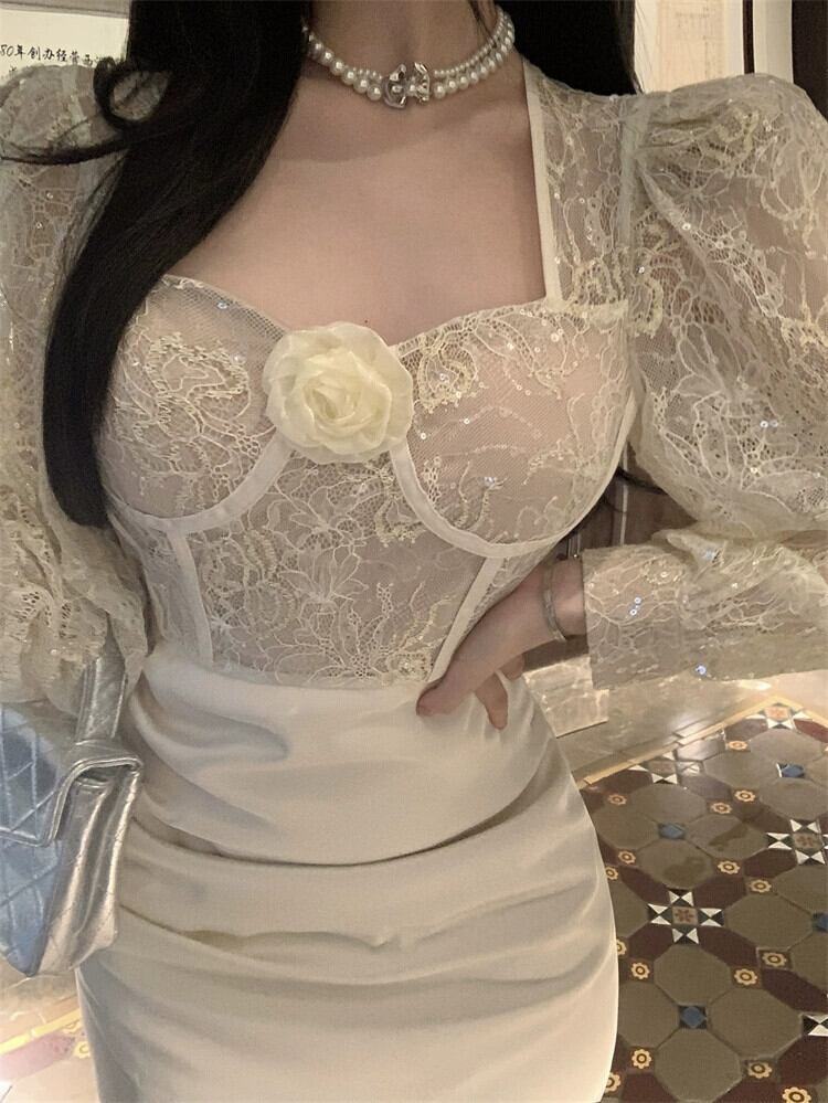 フレンチスクエアネックレースドレス女性秋痩身とエレガントな女性のヒップカバースカート新しい長袖ショートスカート ロング オータム 秋物 スクウェア nana39317917680 | modepoisson