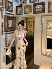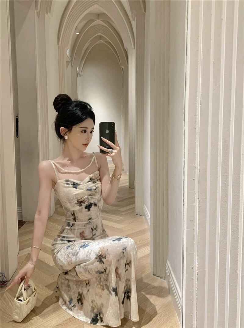 レトロ淑やかな気質背中の開いたロングドレスファッショナブルなインクフラワー痩身ベルベットパールサスペンダードレス婦人服 真珠 フラワーデザイン nana74040251502 | modepoisson