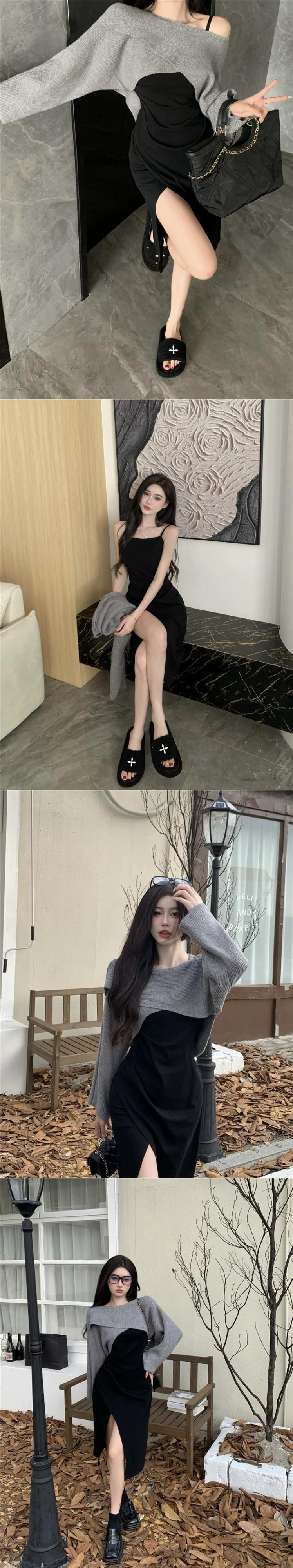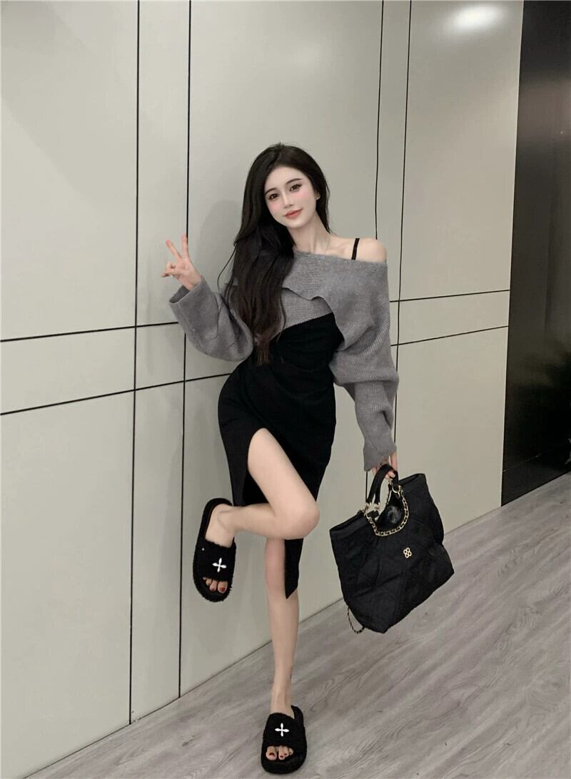 ナナ〜気質ロイヤルシスター甘辛スタイルサスペンダードレス 2 点セット女性秋フレンチニット長袖ブラウス ロング 大人ガーリー スウィート キュート カジュアル オータム 秋物 nana9555817608 | modepoisson