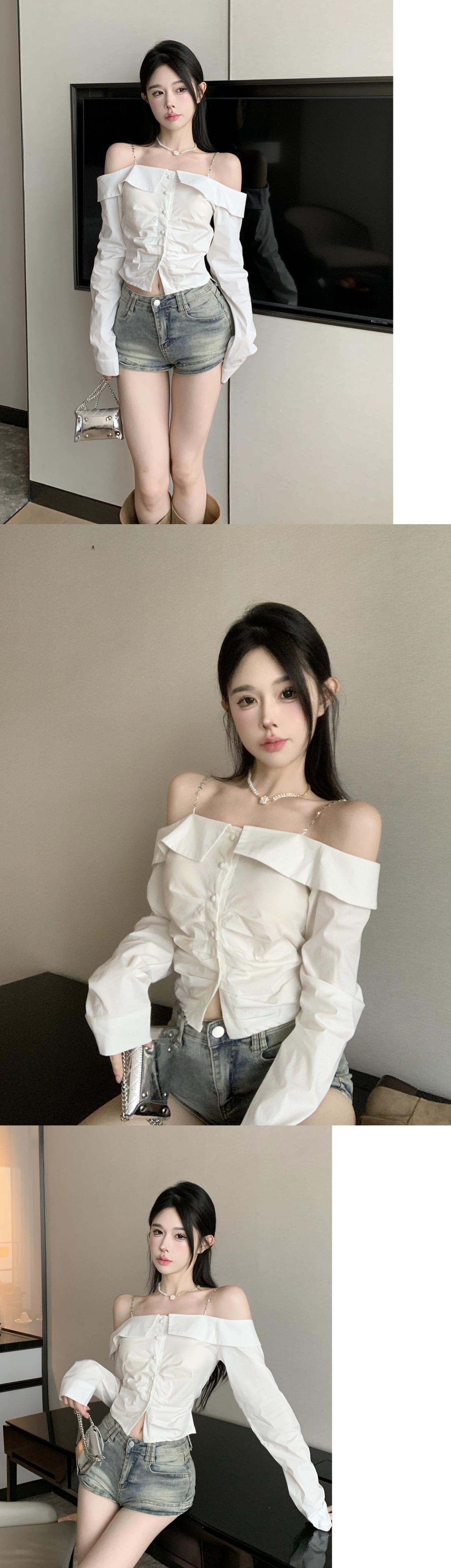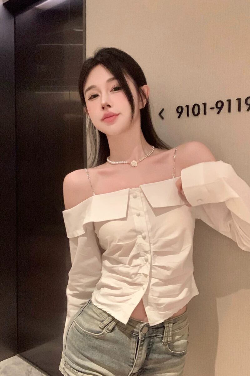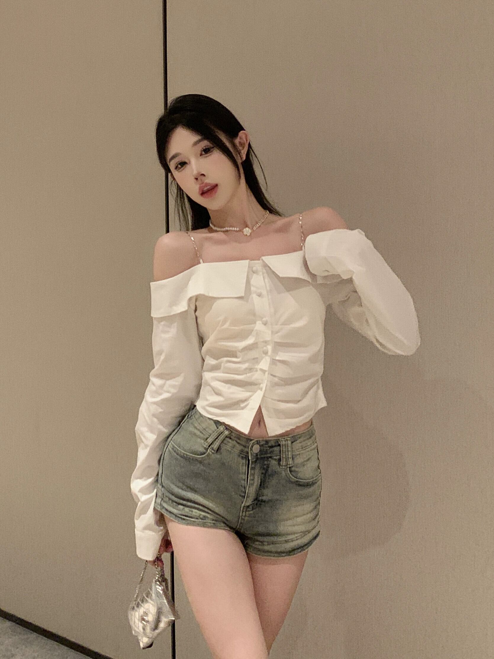 フレンチスリム長袖シャツレディース、初秋ワンショルダーニッチ甘辛スタイルウエスト痩身ショートチューブトップ ロング 大人ガーリー スウィート キュート カジュアル オータム 秋物 nana51822068464 | modepoisson