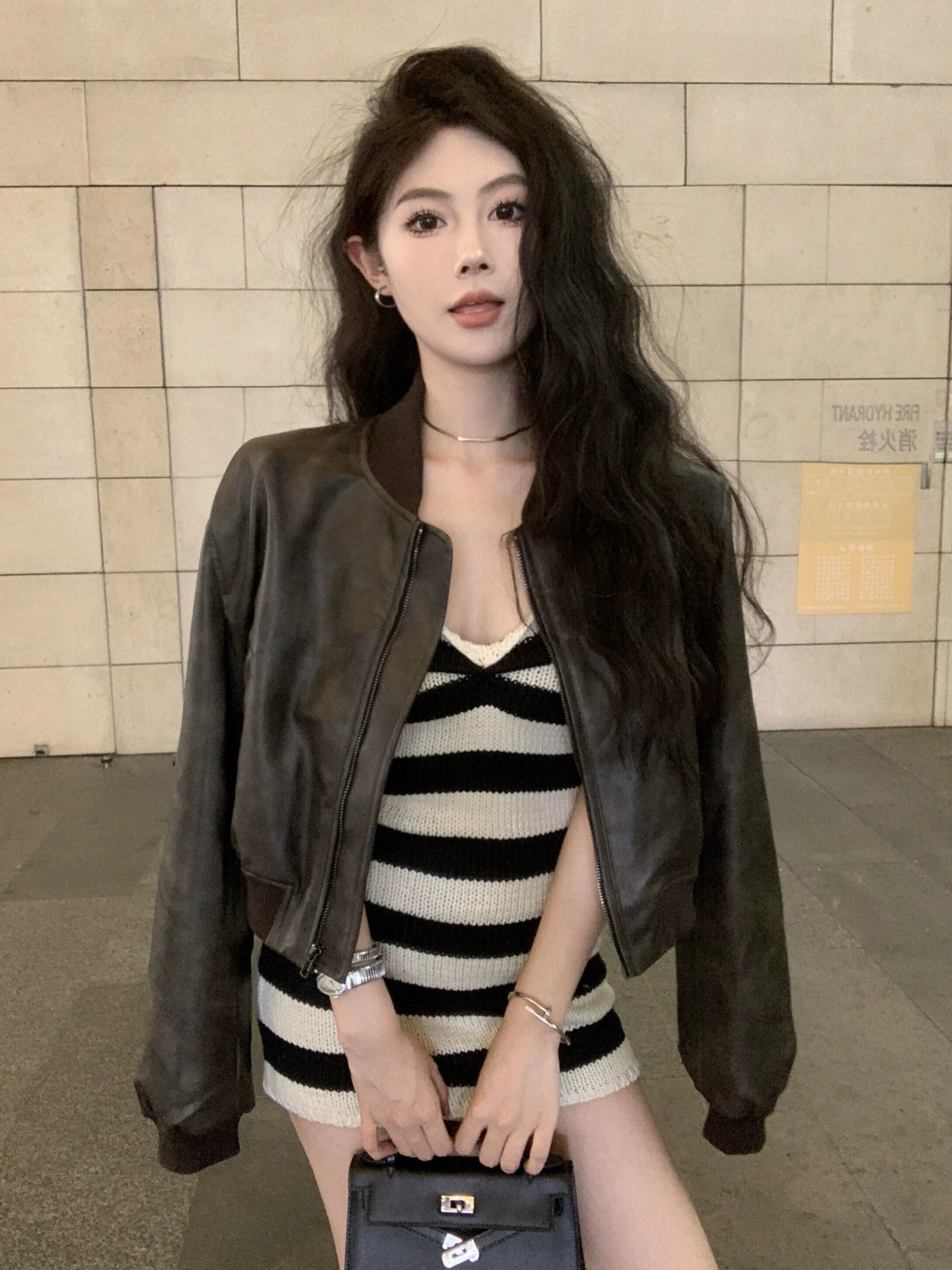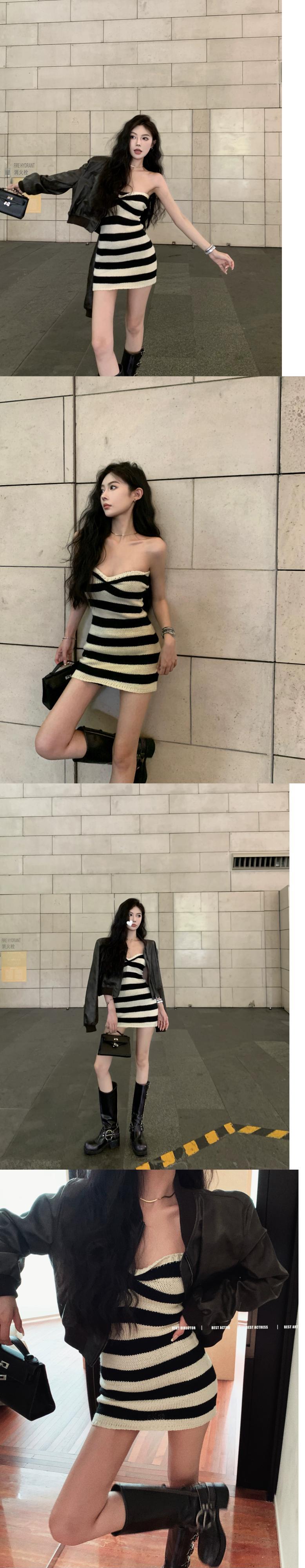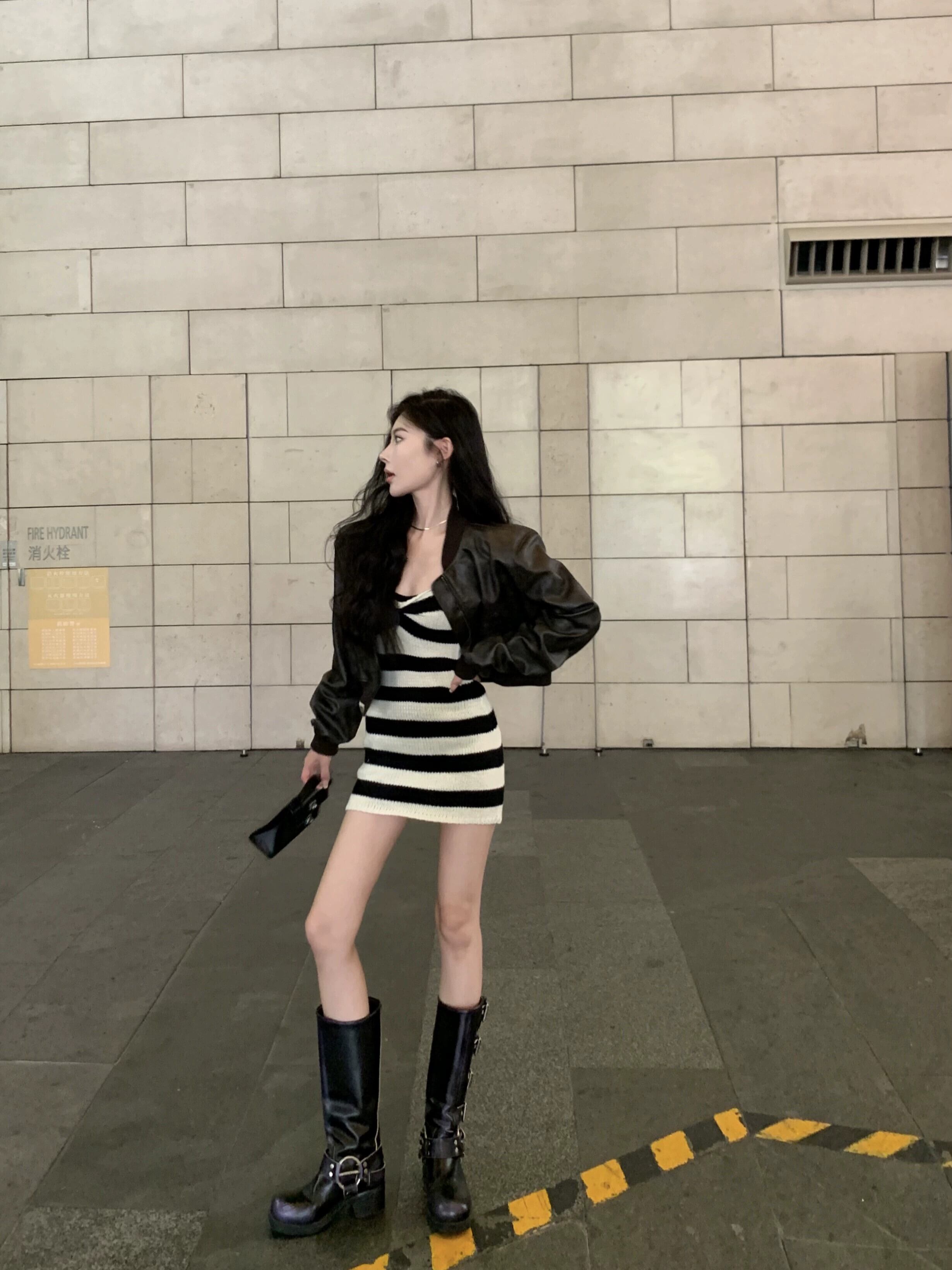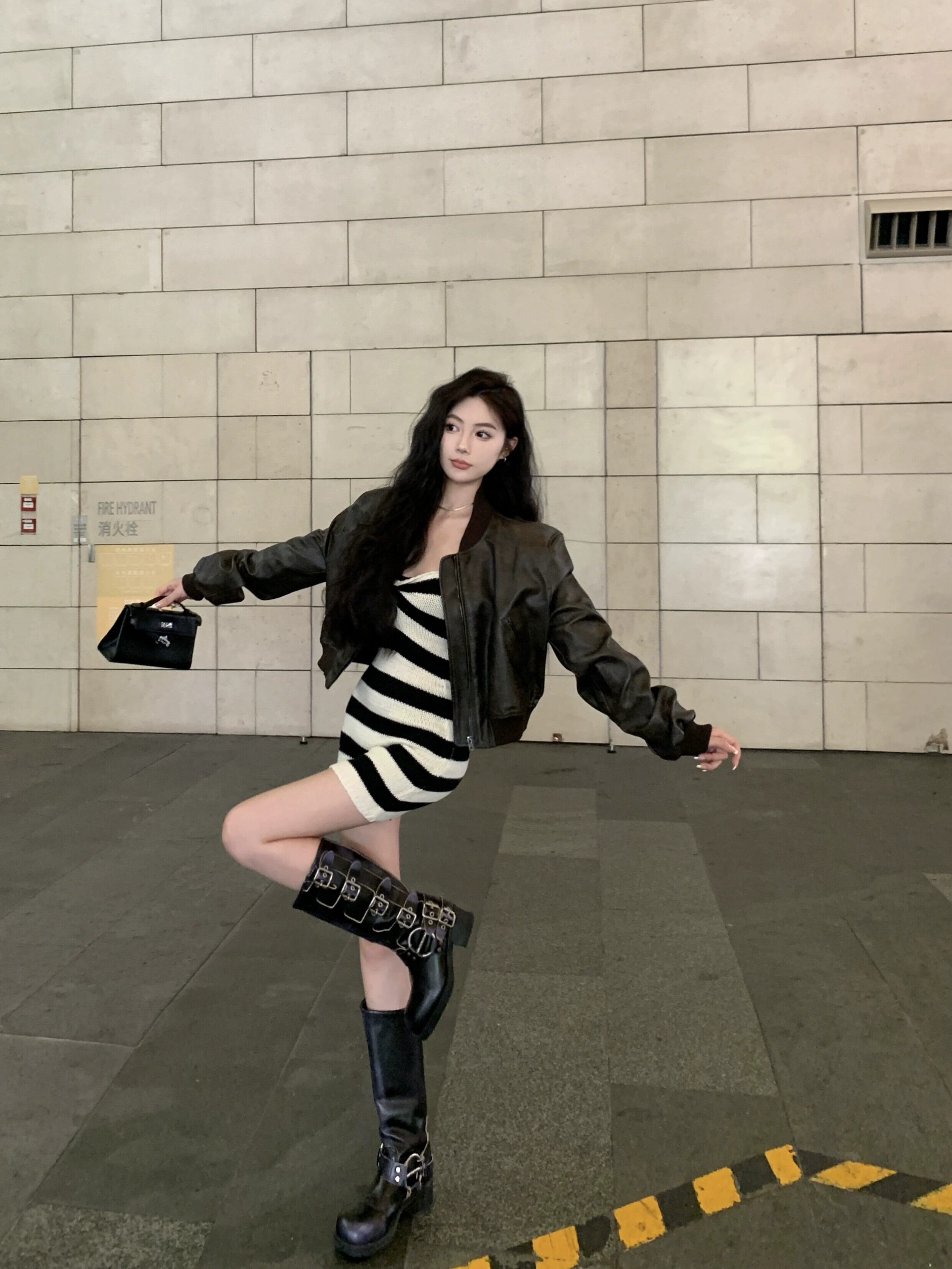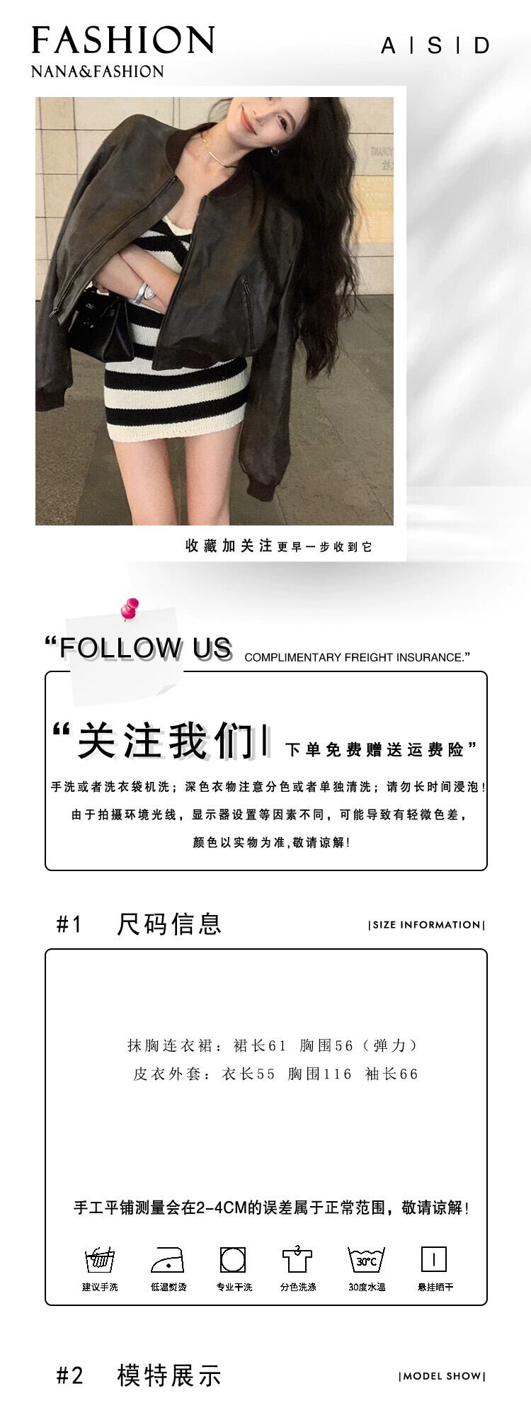 色:ブラックチューブトップスカート,ストライプチューブトップドレス,ブラウンレザージャケット