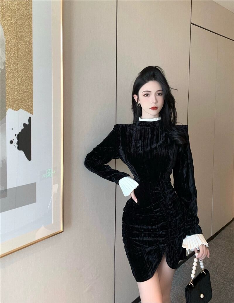 フランスのハイエンドブラックドレスの女性の秋と冬の新しい長袖ヒップスカート気質ウエストベルベットリトルブラックドレス ロング オータム 秋物 ウィンター 冬物 nana66755567717 | modepoisson