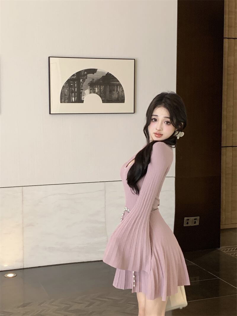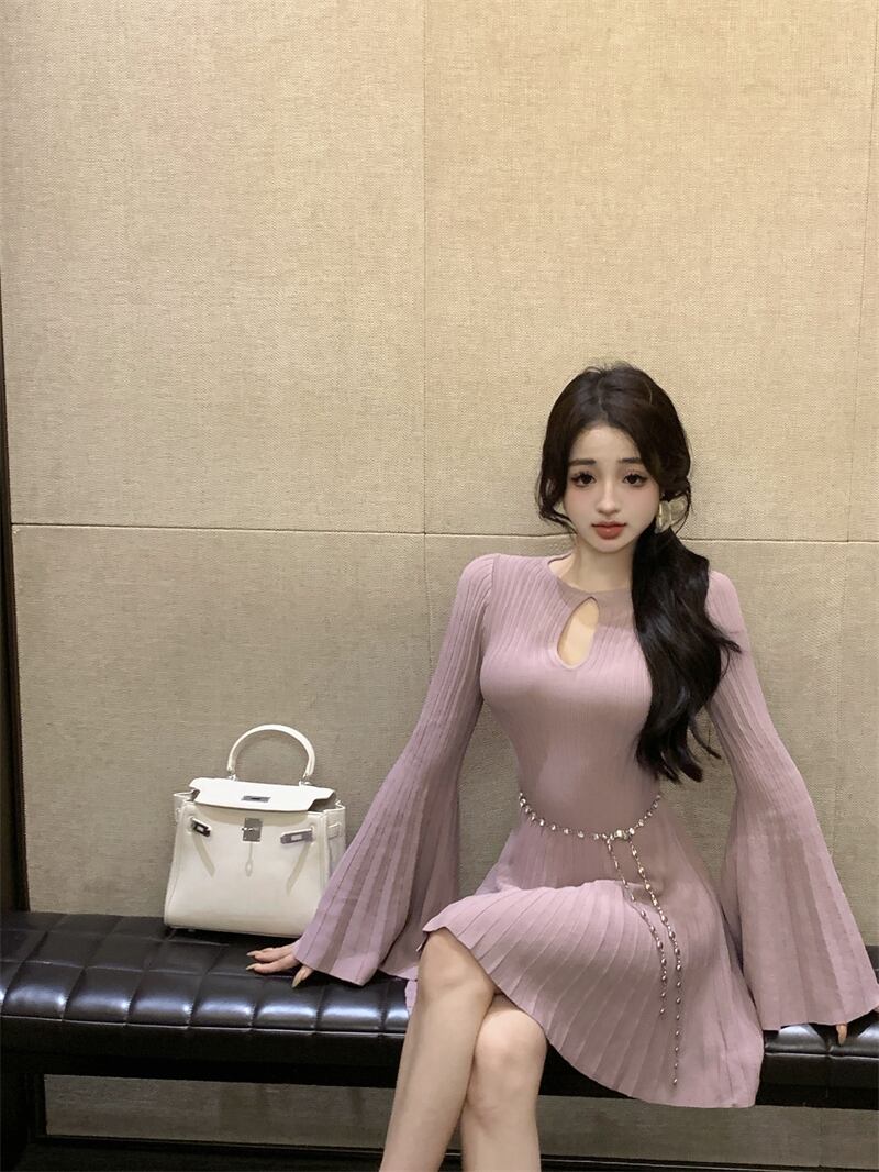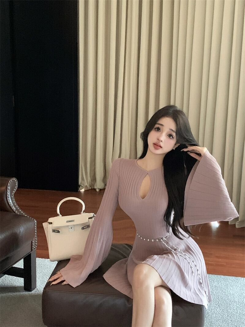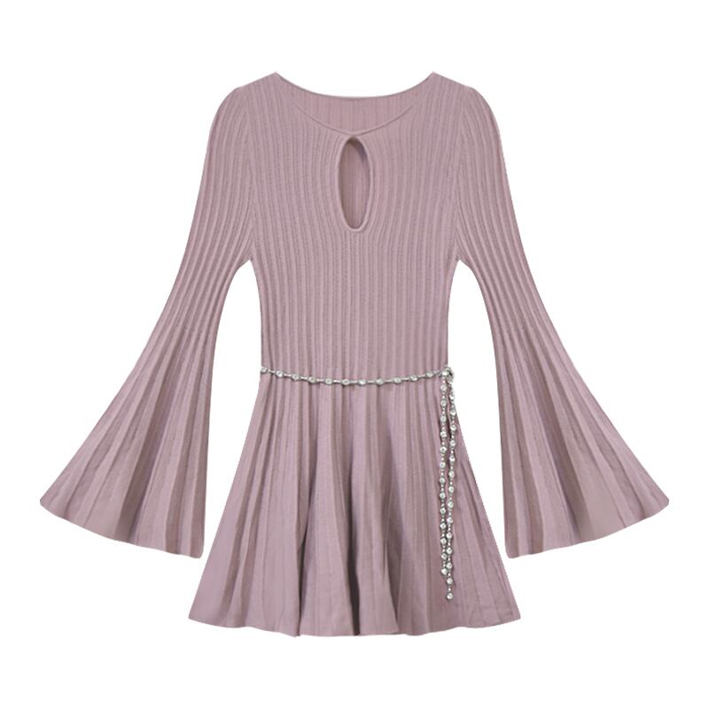 フランス王室姉妹スタイルのニットドレス、ハイエンドニッチ、スリムフィット、長袖、中空スリミングショートスカート、レディース秋スカート ロング オータム 秋物 nana57064083941 | modepoisson