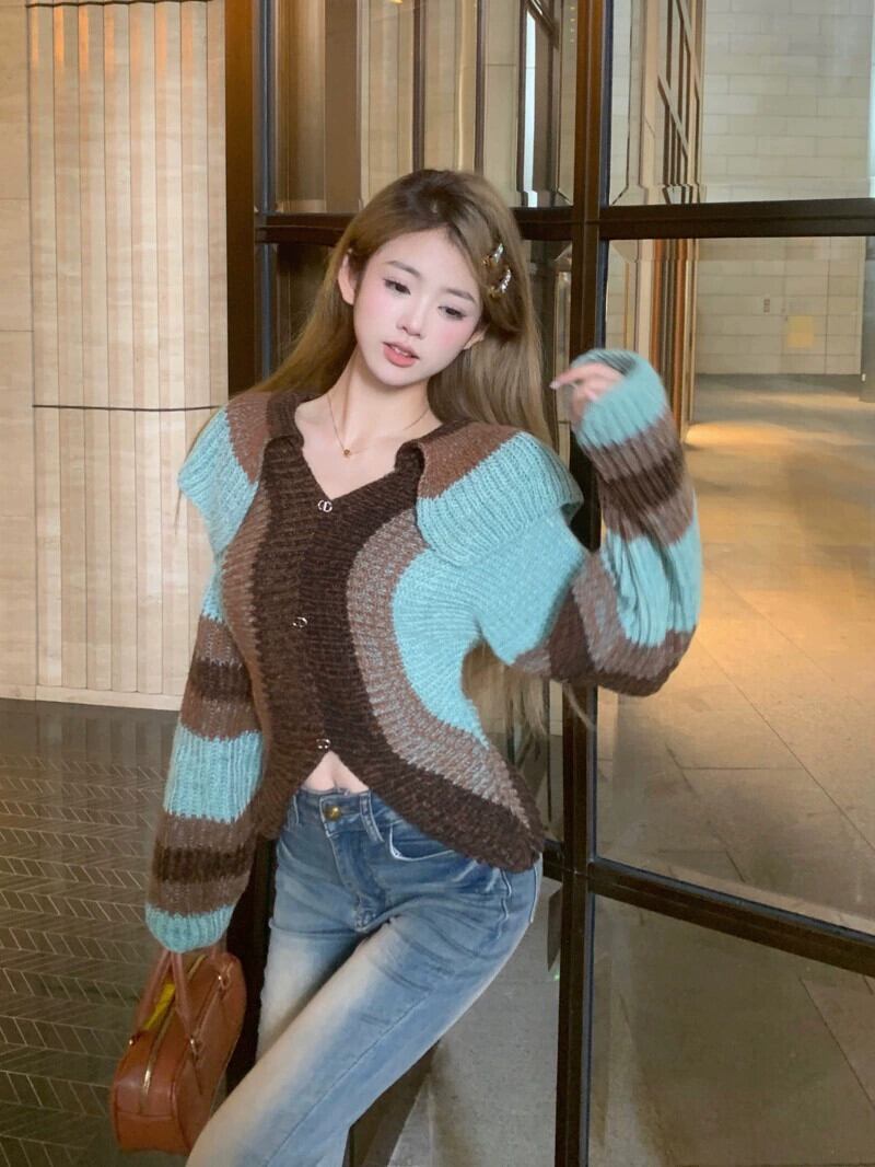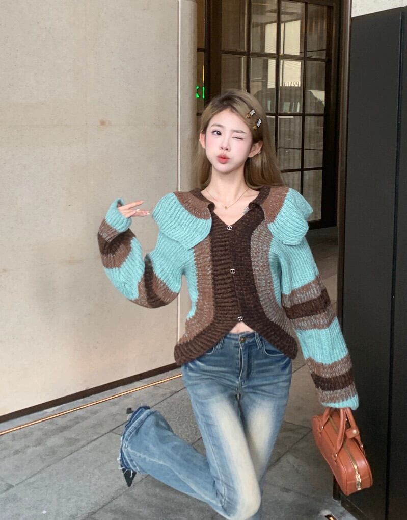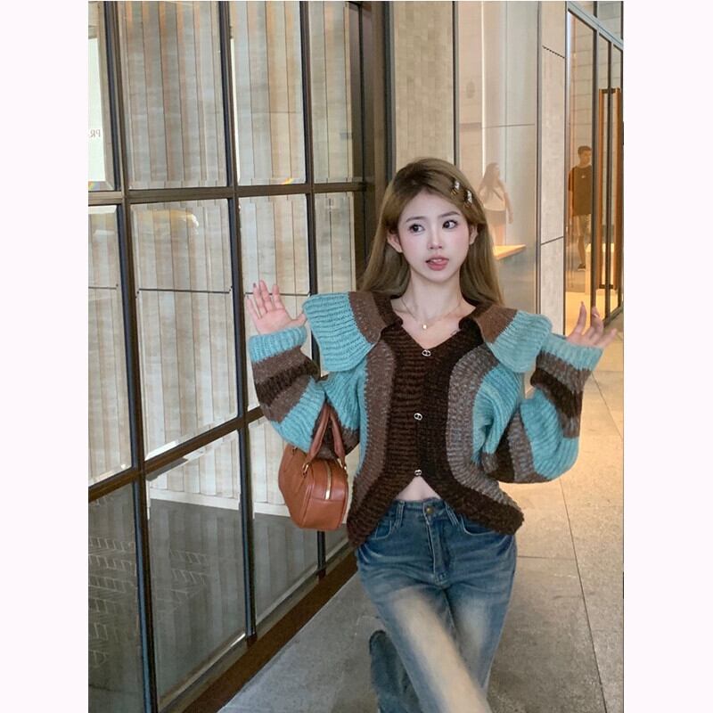ニッチショートストライプニットカーディガンジャケット女性秋と冬の新しい小さなコントラストカラーセータートップ オータム 秋物 ウィンター 冬物 nana76256543143 | modepoisson