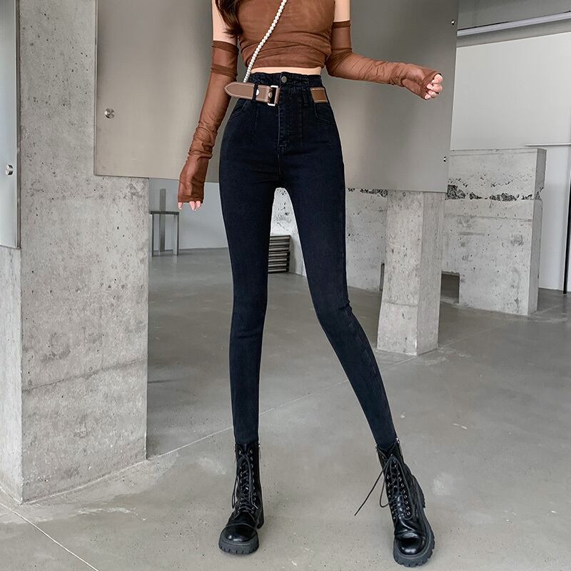 スタイルファッショナブルなベルトデザイン付きハイウエストストレッチジーンズ、スリムで多用途なペンシルパンツレディース、新しいスタイル ハーネス nana52600282022 | modepoisson