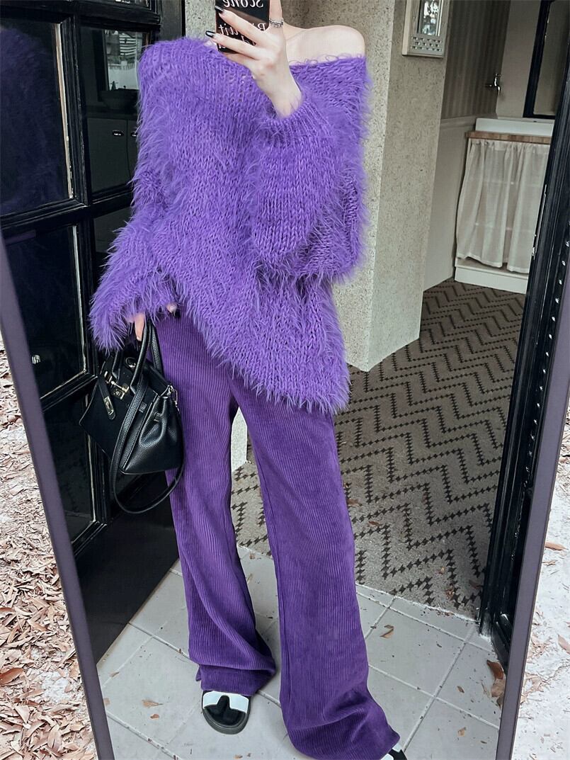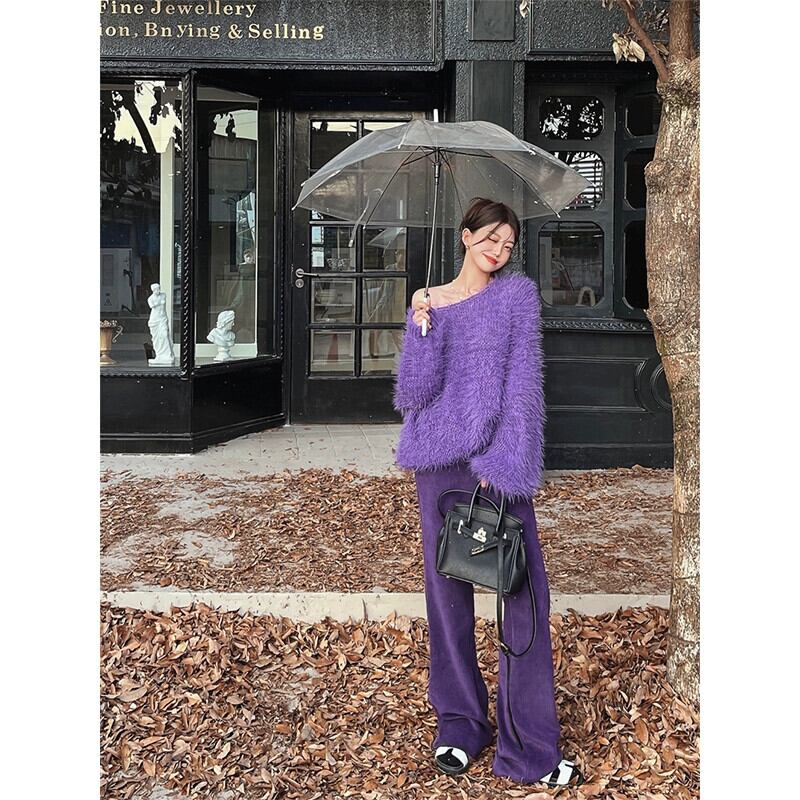 フランス怠惰なスタイル紫色のセーター 2023 インターネットセレブスタイルスーツワイドレッグパンツとズボンの 2 点セット女性秋の新スタイル オータム 秋物 ワイドパンツ パープル nana8887099943 | modepoisson