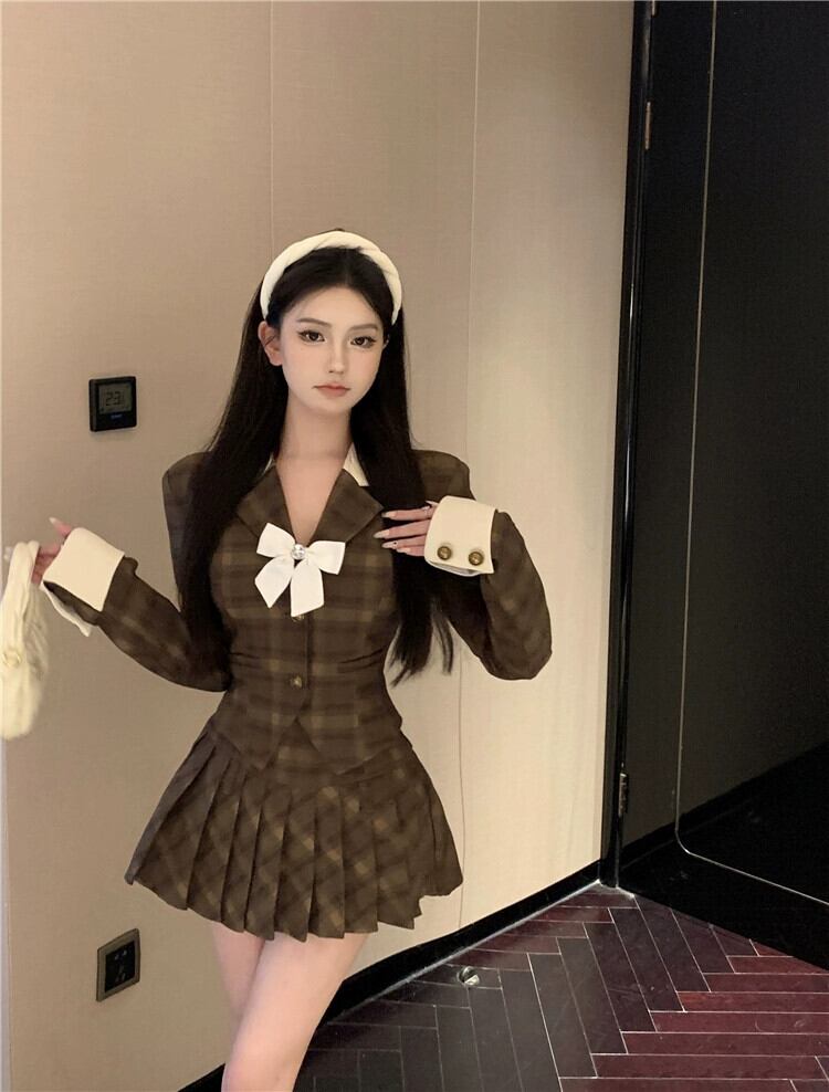 チェック柄のカレッジスタイルの女性の秋の小さなスーツ、スリムな長袖ショートトップ、ハーフレングスのプリーツスカートのツーピーススーツ ロング オータム 秋物 nana98534839506 | modepoisson