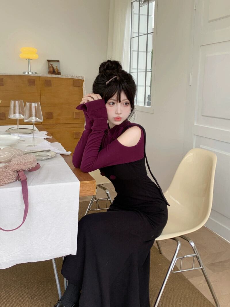 甘いネクタイサスペンダーフィッシュテールドレスニッチデザインパープルオフショルダートップファッショナブルでセクシーな2点セット 大人ガーリー スウィート キュート カジュアル nana90589760360 | modepoisson