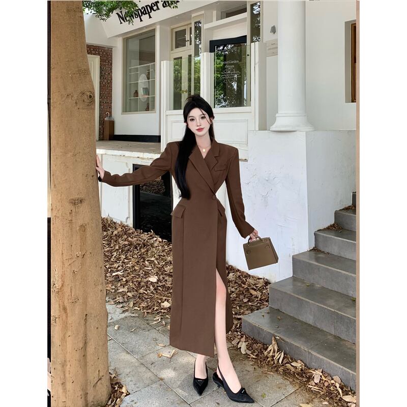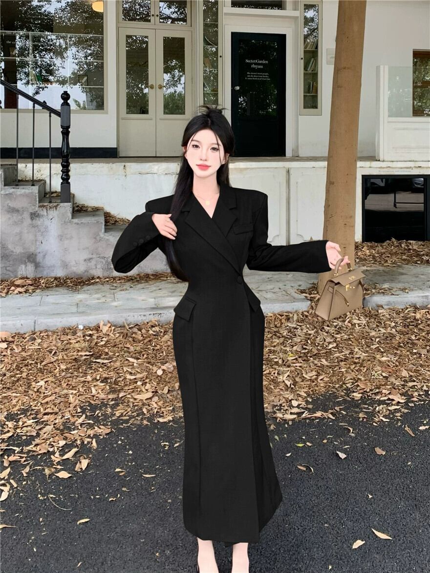 フランスの気質スリムドレスの女性の秋長袖ウエスト痩身 V ネックスカートヨーロッパ商品 2023 新作ロングスカート オータム 秋物 Vネック ヨーロピアン nana20998356901 | modepoisson