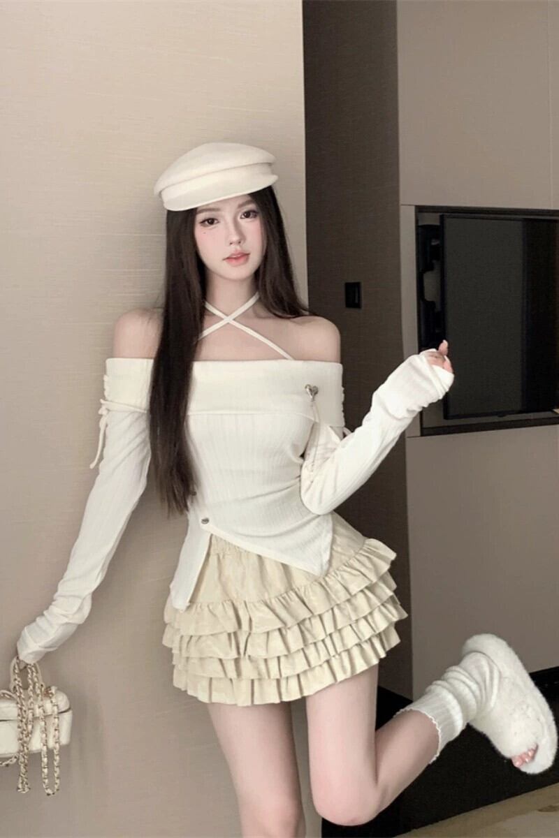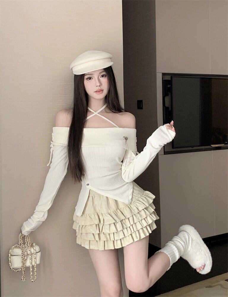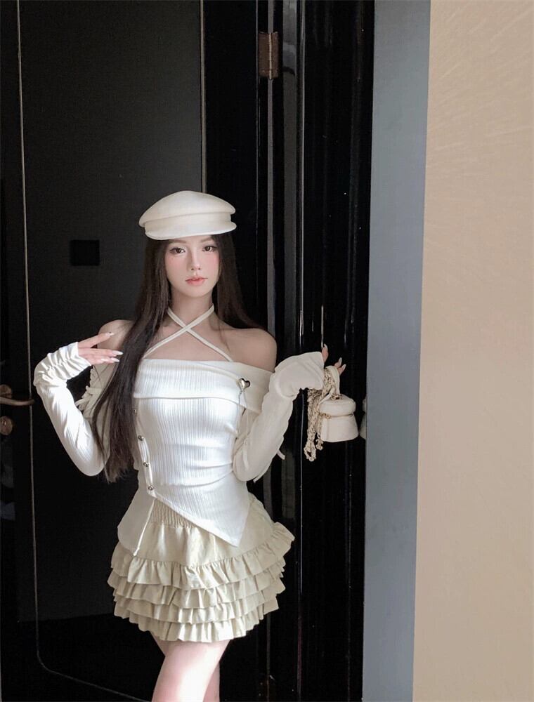 秋のミルクティー風コーデ、老け見えスーツ一式、スカート、ホルタートップス、ハーフ丈ケーキスカート、初秋のレディース2点セット オータム 秋物 nana33718267177 | modepoisson