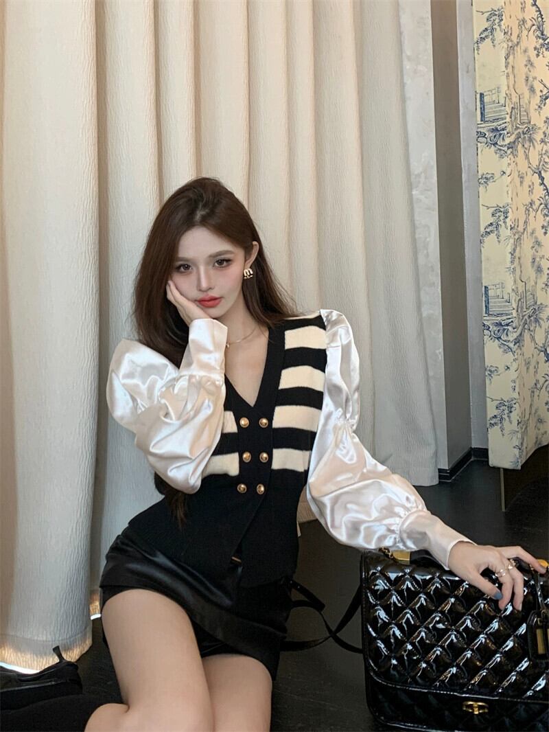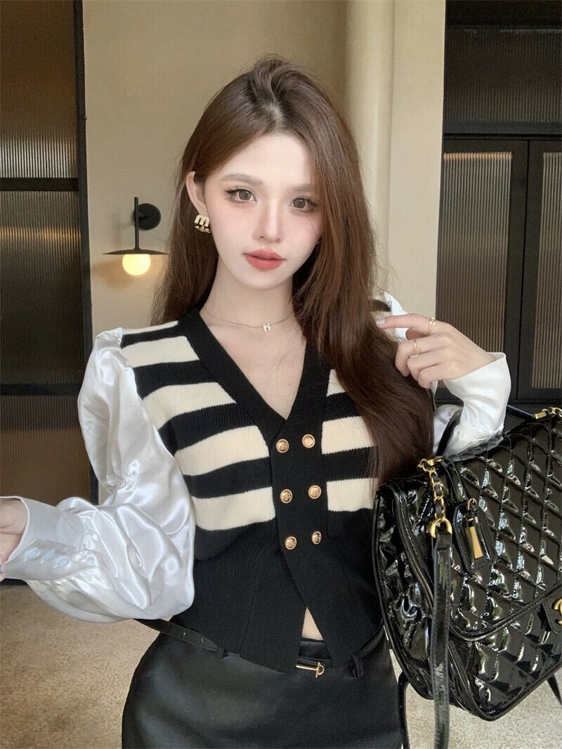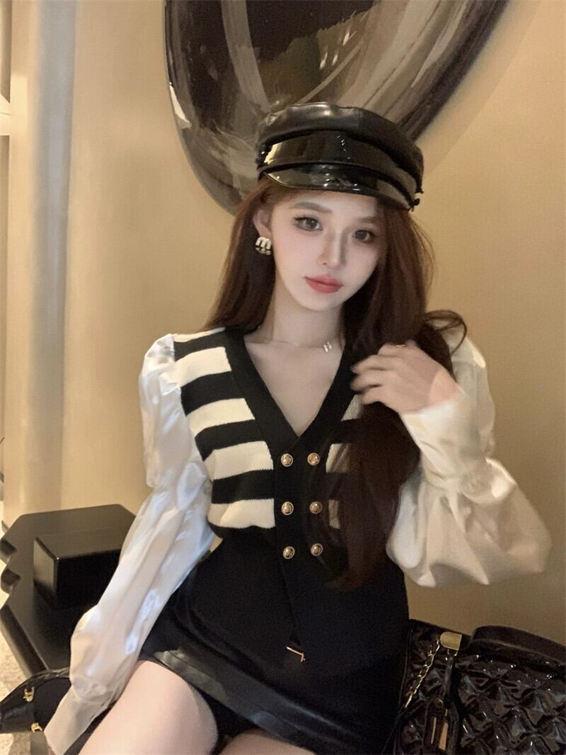 パフスリーブとスプライス長袖スリムシャツトップのフランスのvネックハイエンドニットセーター女性2023春と秋の新しいスタイル ロング スプリング 春物 オータム 秋物 nana6699931627 | modepoisson