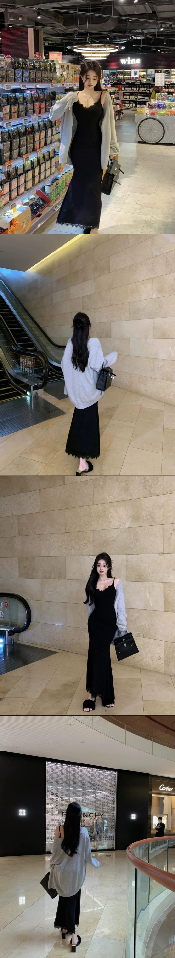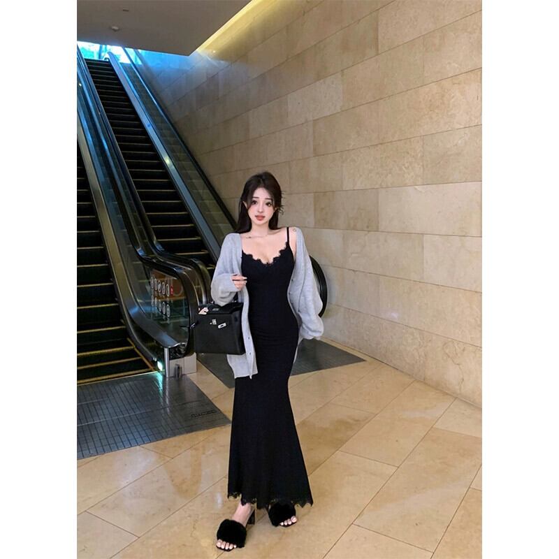 気質黒のサスペンダードレスの女性の初秋の新スリムフィットヒップハグロングスカートセーターファッションツーピーススーツ ブラック オータム 秋物 nana4977358692 | modepoisson