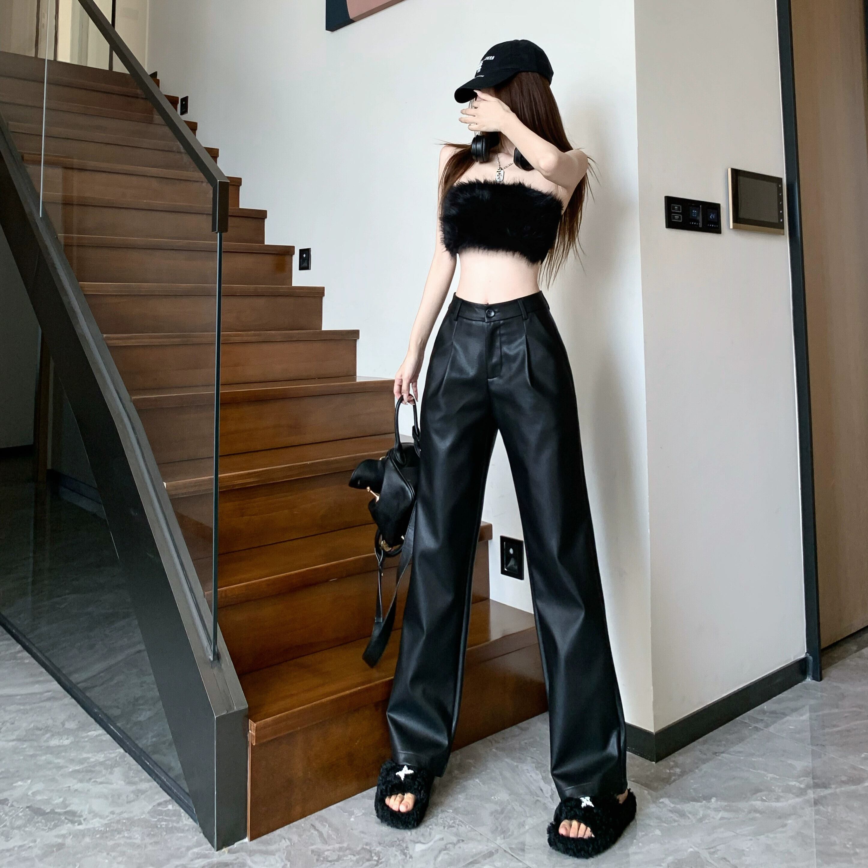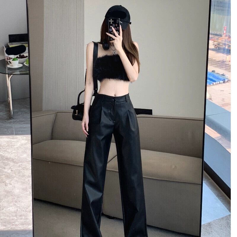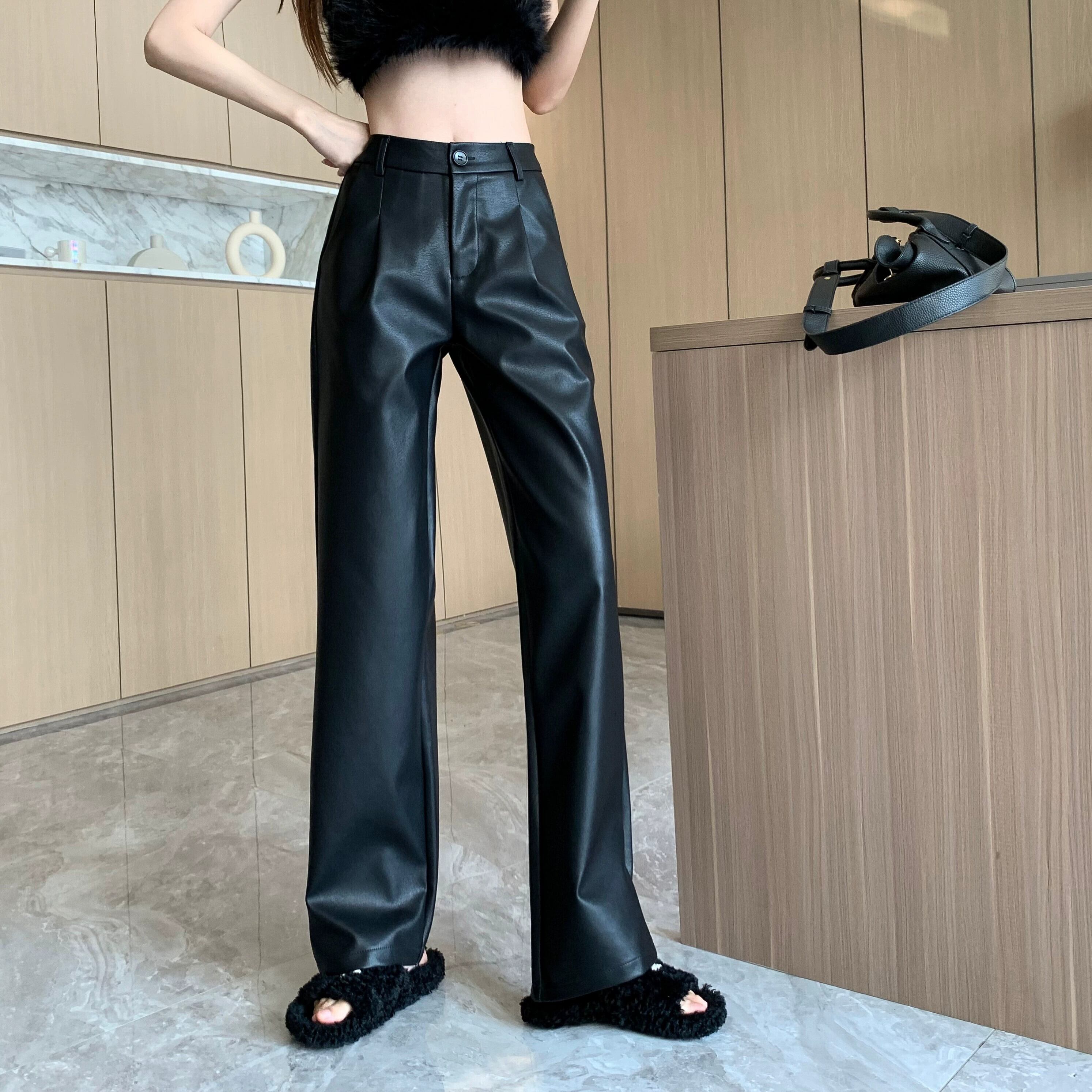 ストレートスリムレザーパンツカジュアルパンツ女性ルーズ2023新しい秋と冬のヨーロッパスタイルパンツ黒ワイドレッグパンツ ブラック オータム 秋物 ウィンター 冬物 ワイドパンツ ヨーロピアン nana16119429029 | modepoisson