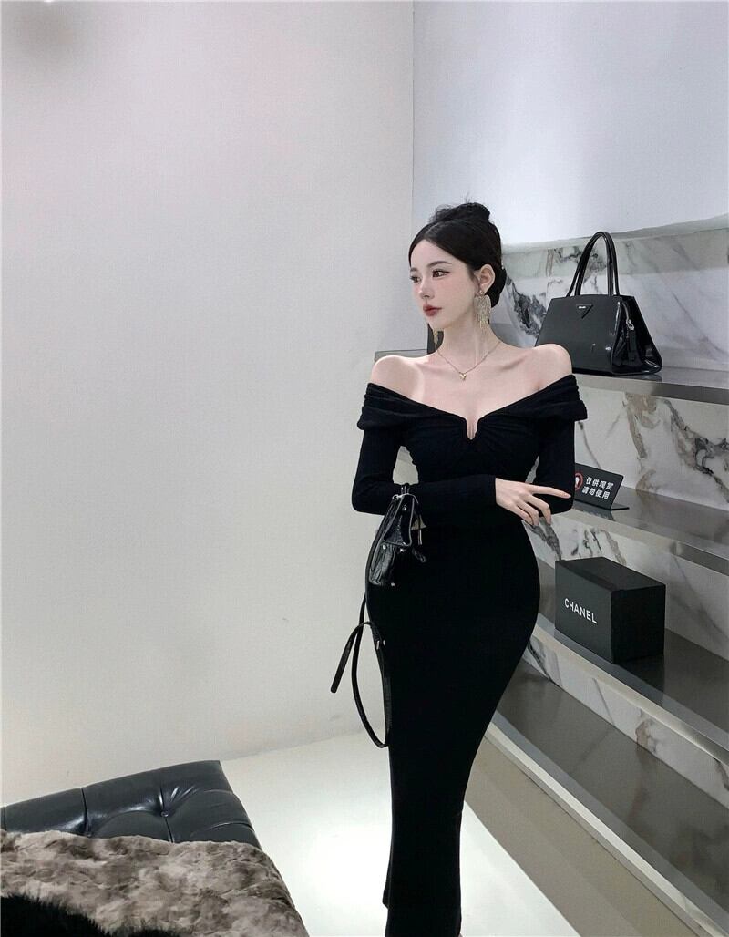 気質ドレスの女性の秋冬ウエストスリムスリム長袖 2023 スカート黒ワンショルダーロングスカート ブラック オータム 秋物 ウィンター 冬物 nana86534690146 | modepoisson
