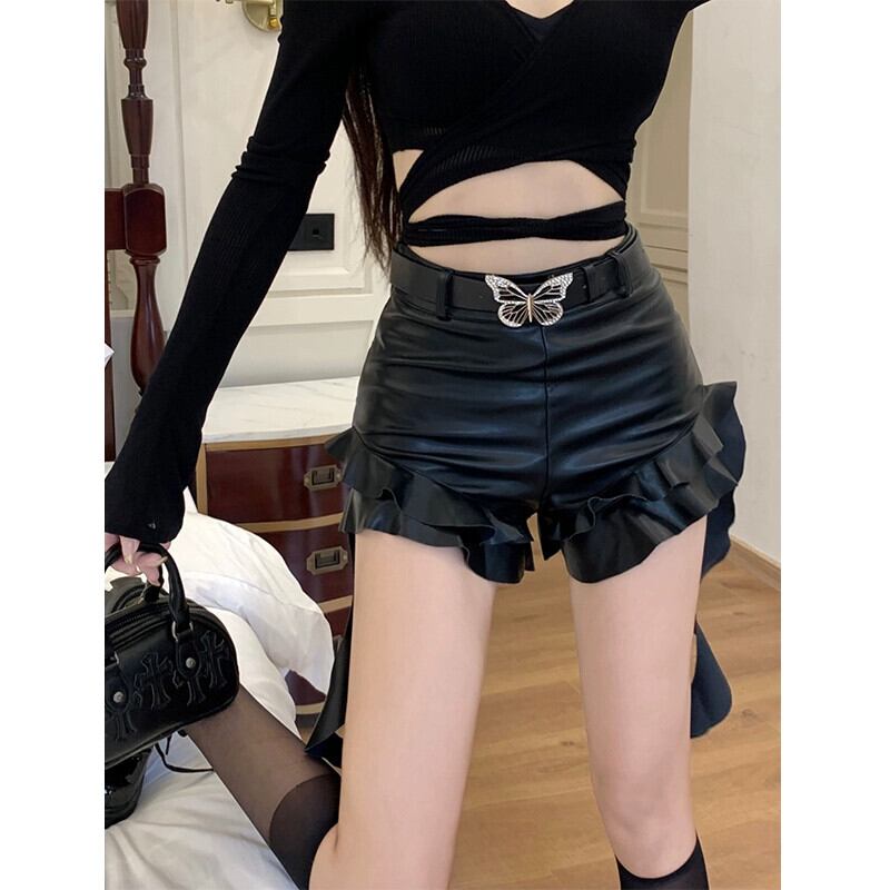 アメリカンホットガールパンツウエストブラックレザーパンツレディース今年の人気パンツ2023秋ショートパンツ オータム 秋物 ショーツ ブルマー nana18989602047 | modepoisson