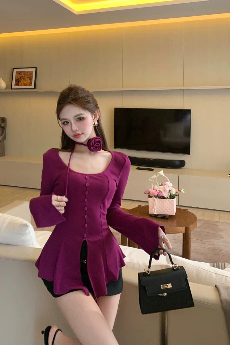 ナナ〜優しいスタイル純粋な欲望ショート U ネック長袖 T シャツレディースウエスト痩身不規則なトップボトリングシャツ ロング Tシャツ ピュア nana67684806401 | modepoisson