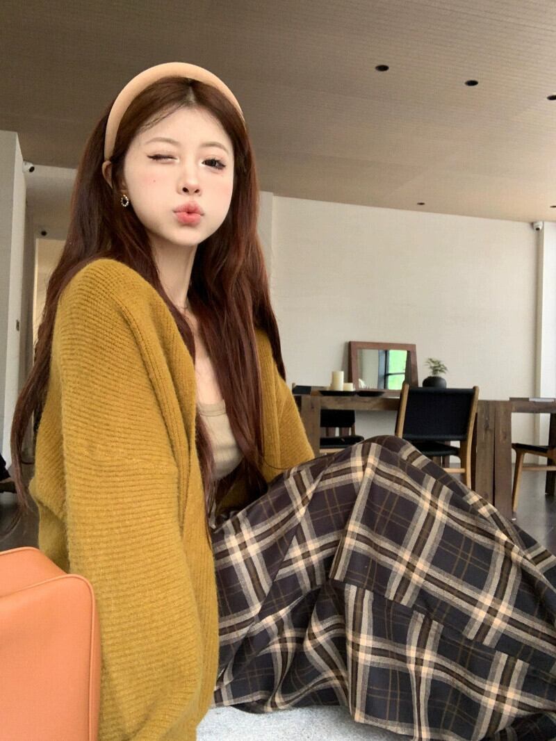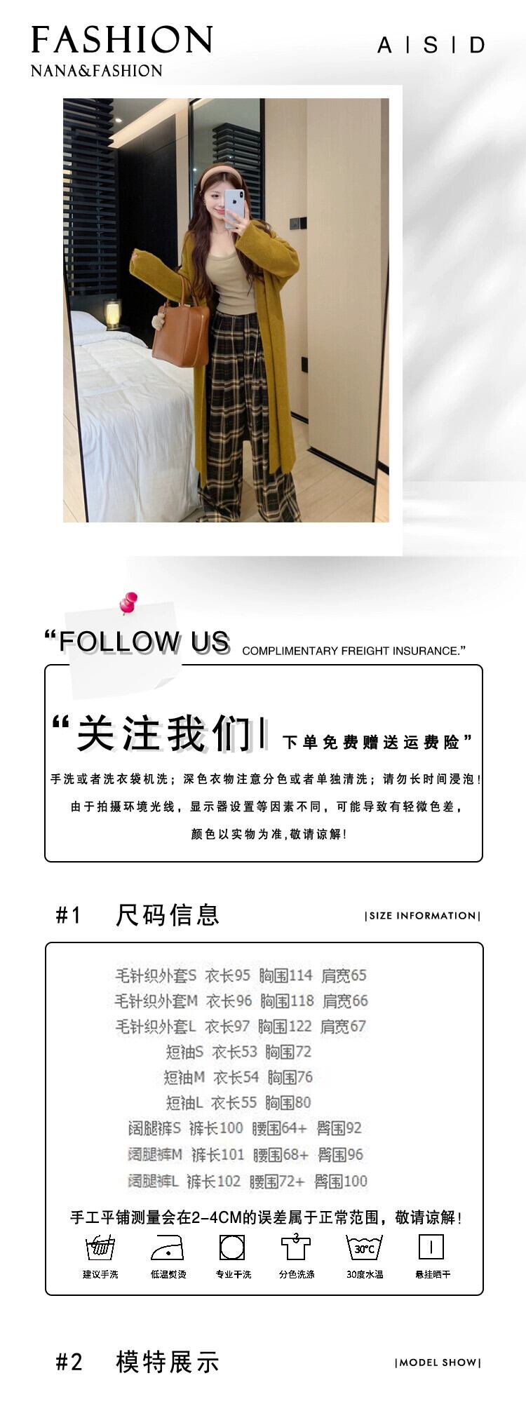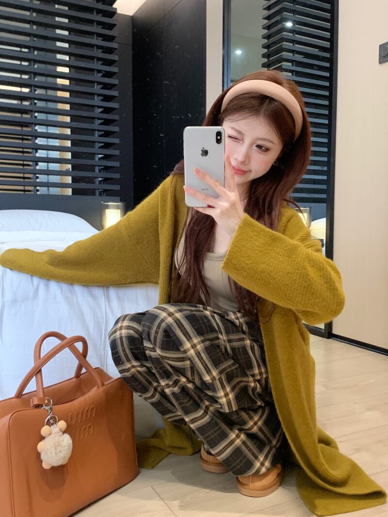 色:ブラウンベスト,ヴィンテージグリーンニットカーディガン,ブラックチェック柄ワイドレッグパンツ