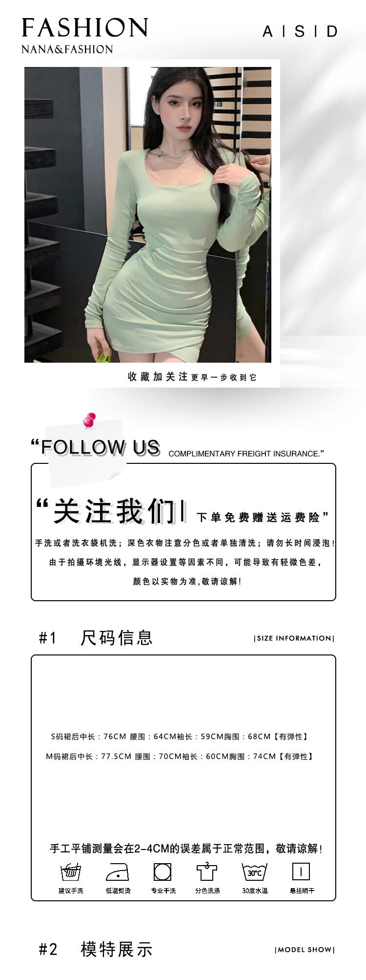 秋の新しいスタイルのソリッドカラーのスクエアネックスリムフィットヒップハグショートスカート、長袖プリーツウエストとボトミングドレスの女性 ロング オータム 秋物 スクウェア nana22575442295 | modepoisson
