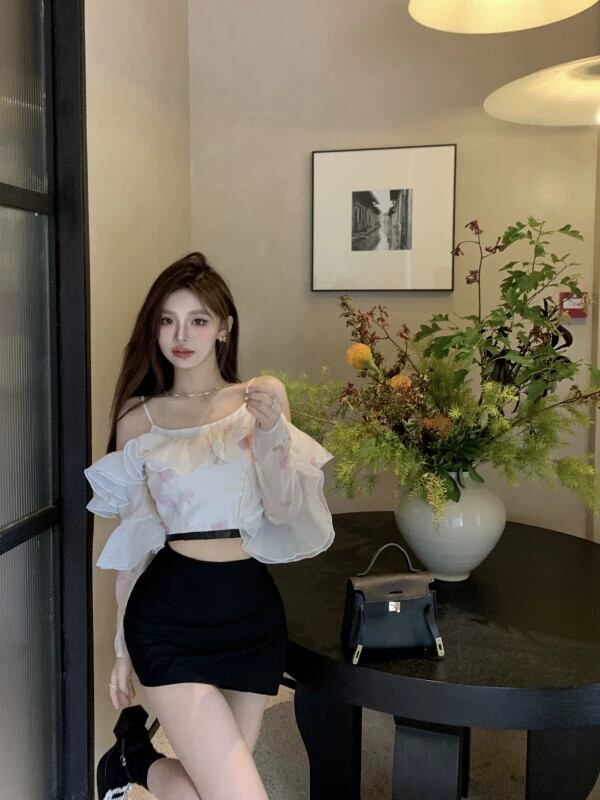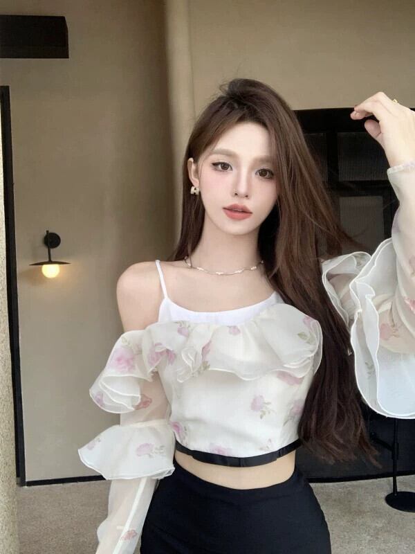 甘い年齢を軽減する多目的デザインのフレンチフェイクツーピースフリルプリントシャツショートパフスリーブトップレディース秋 大人ガーリー スウィート キュート カジュアル オータム 秋物 nana64742026178 | modepoisson
