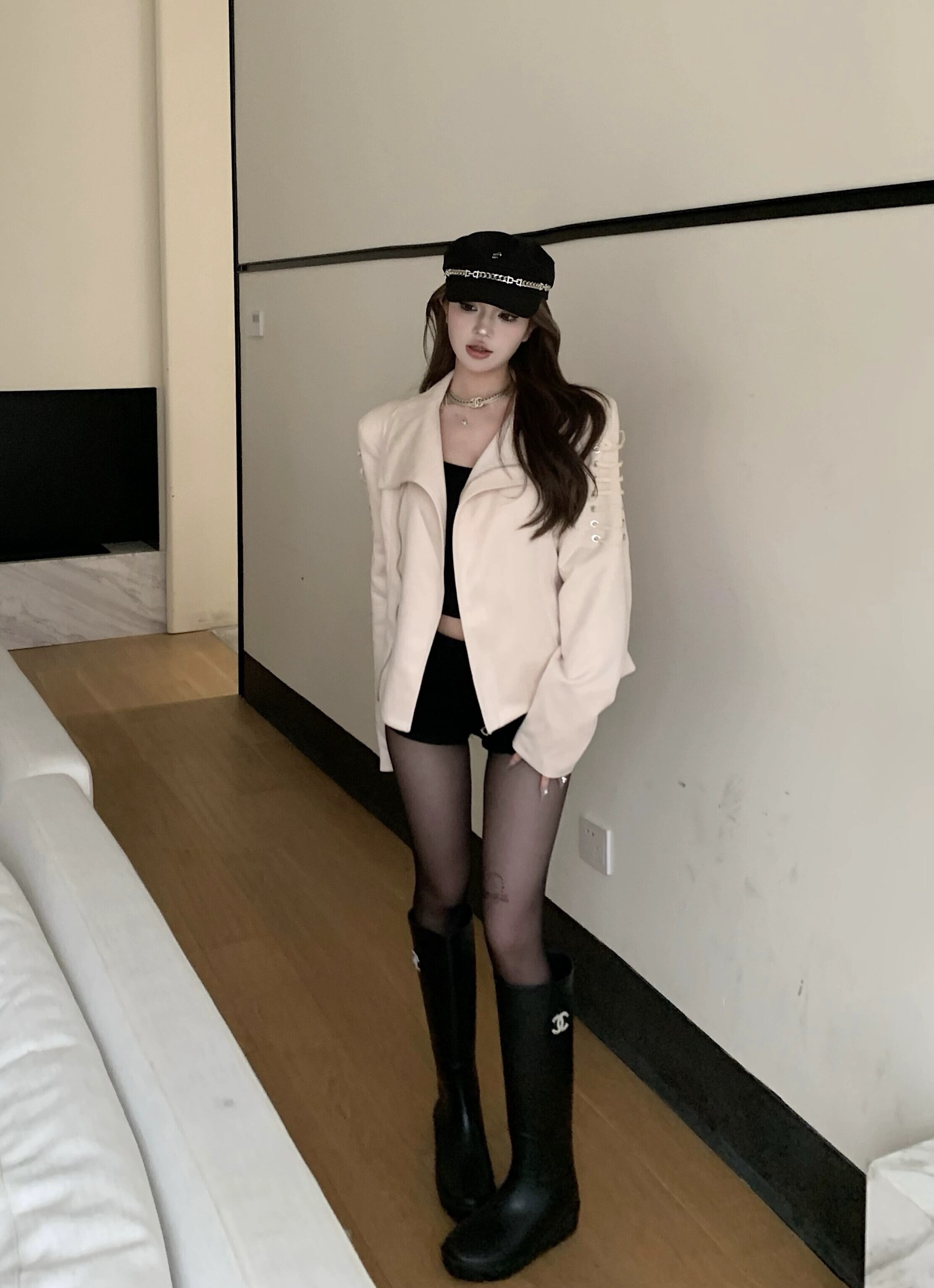 クール Sy スタイルラペルスエードショートジャケット女性の秋アメリカン右肩オートバイジャケットカーディガントップ スウェード オータム 秋物 nana5819634855 | modepoisson
