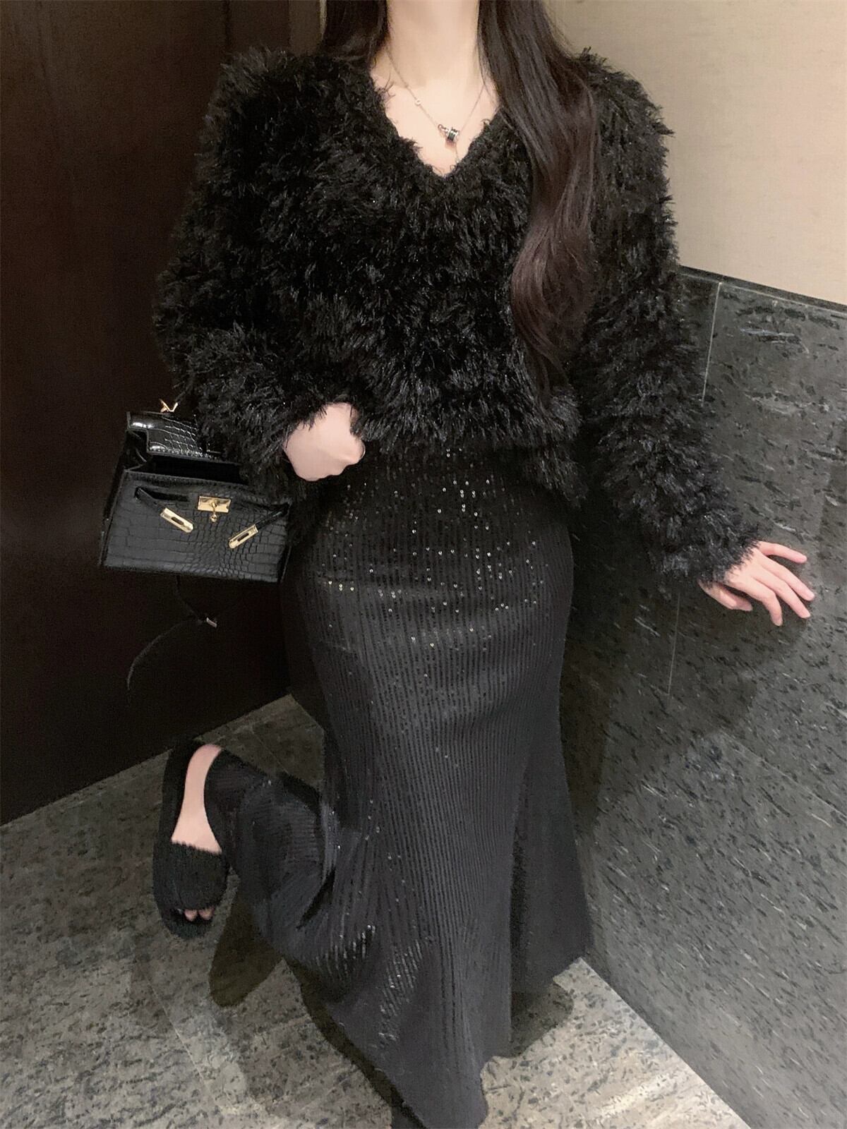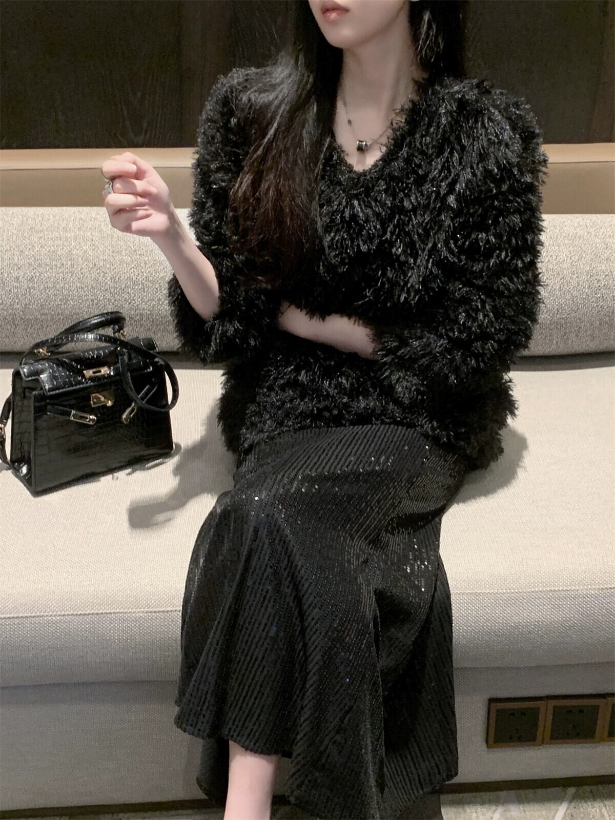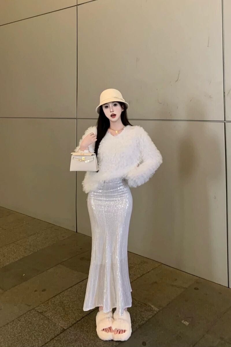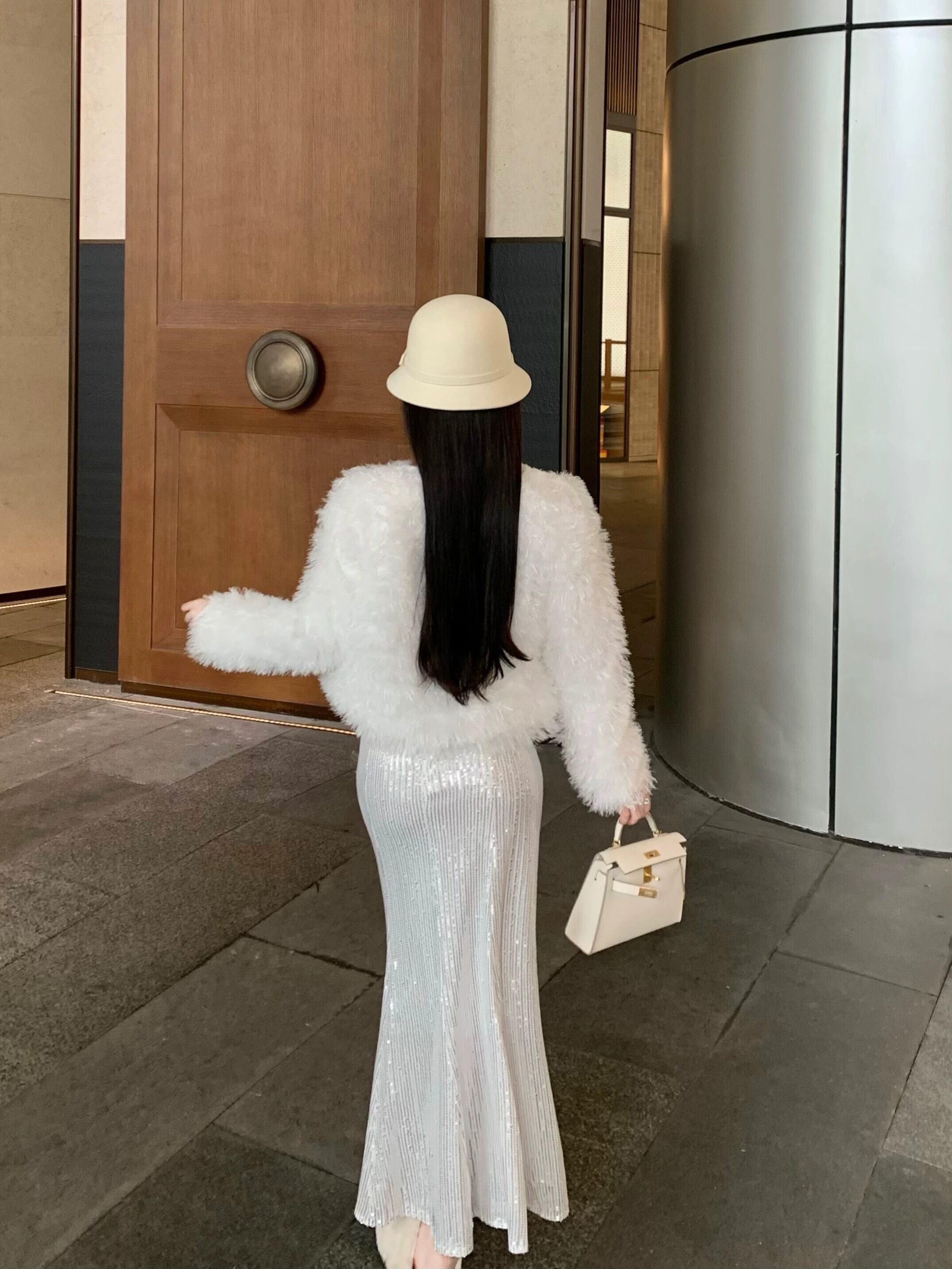 色:ブラックトップ,白のシャツ,黒スパンコールスカート,ホワイトスパンコールスカート