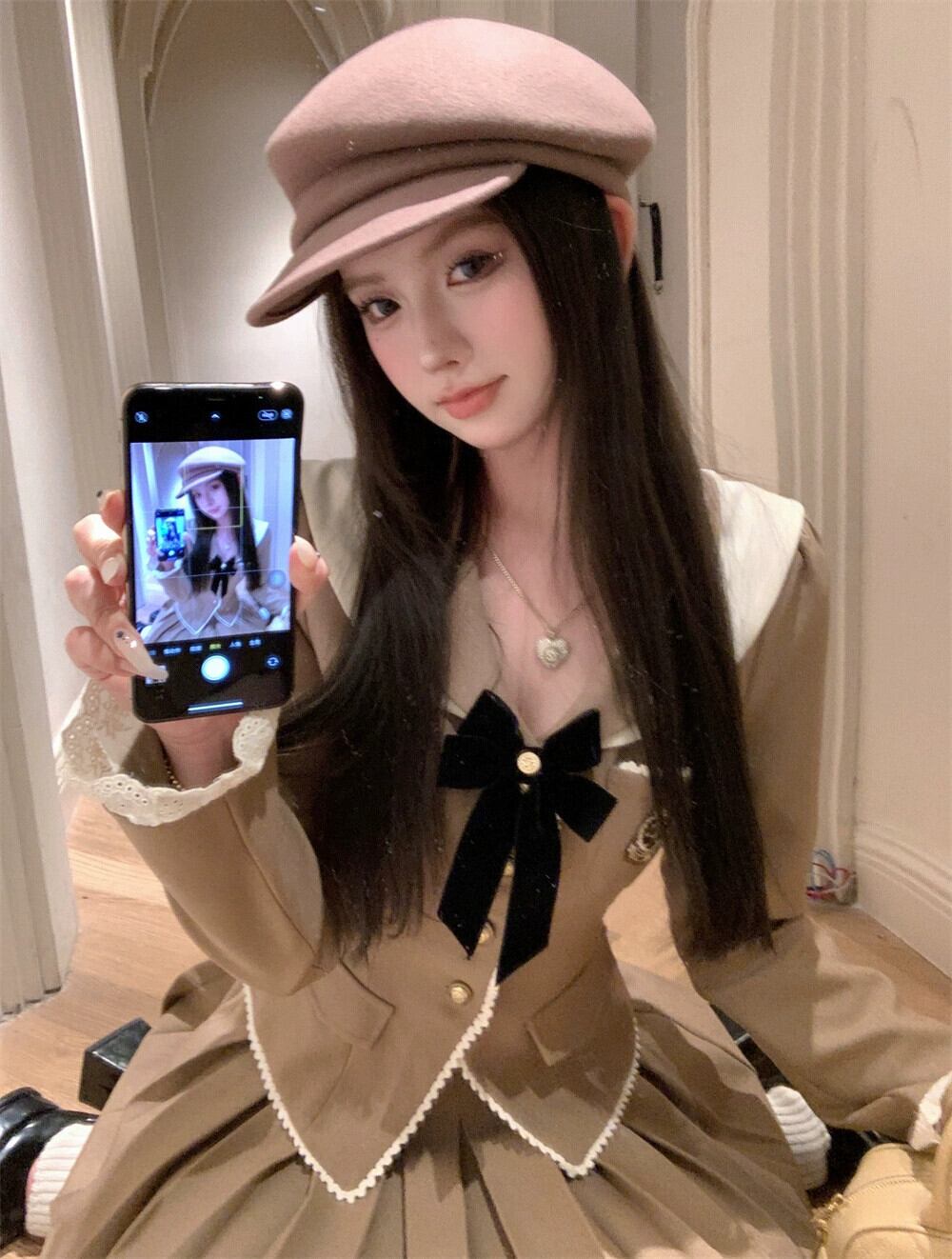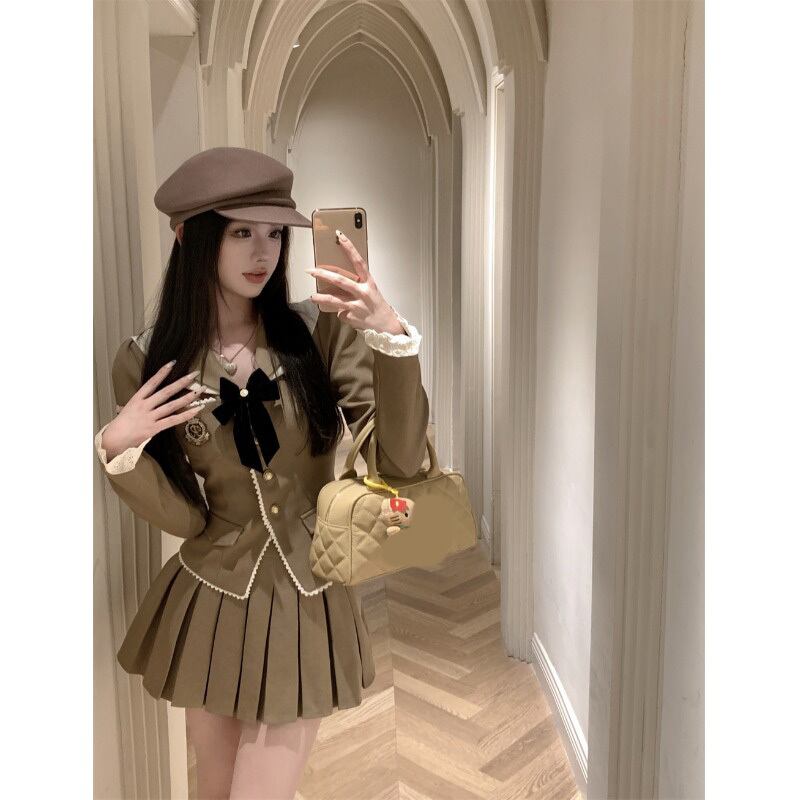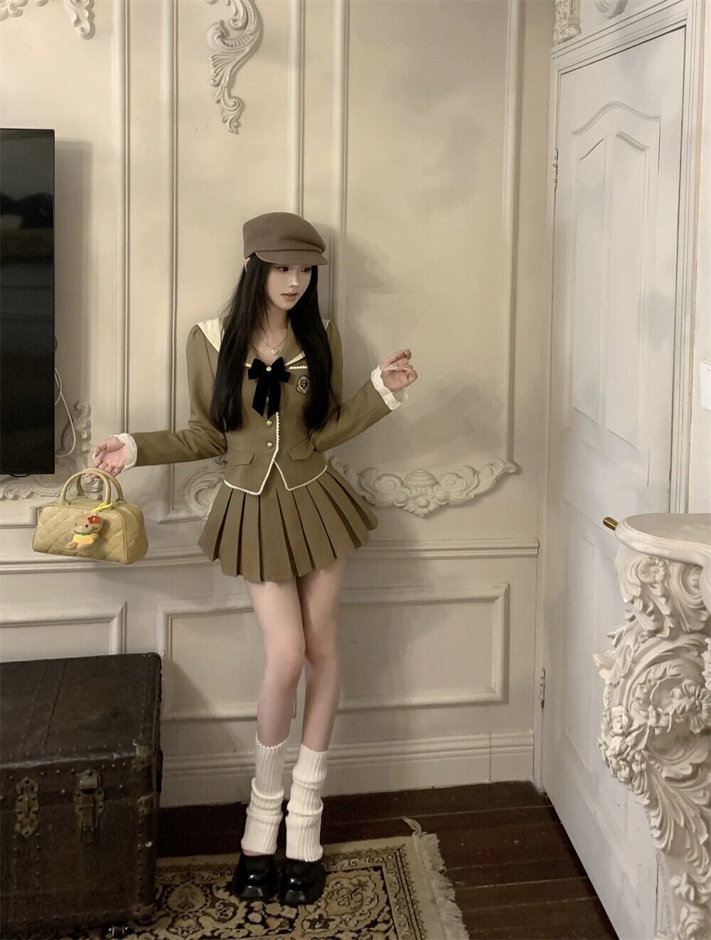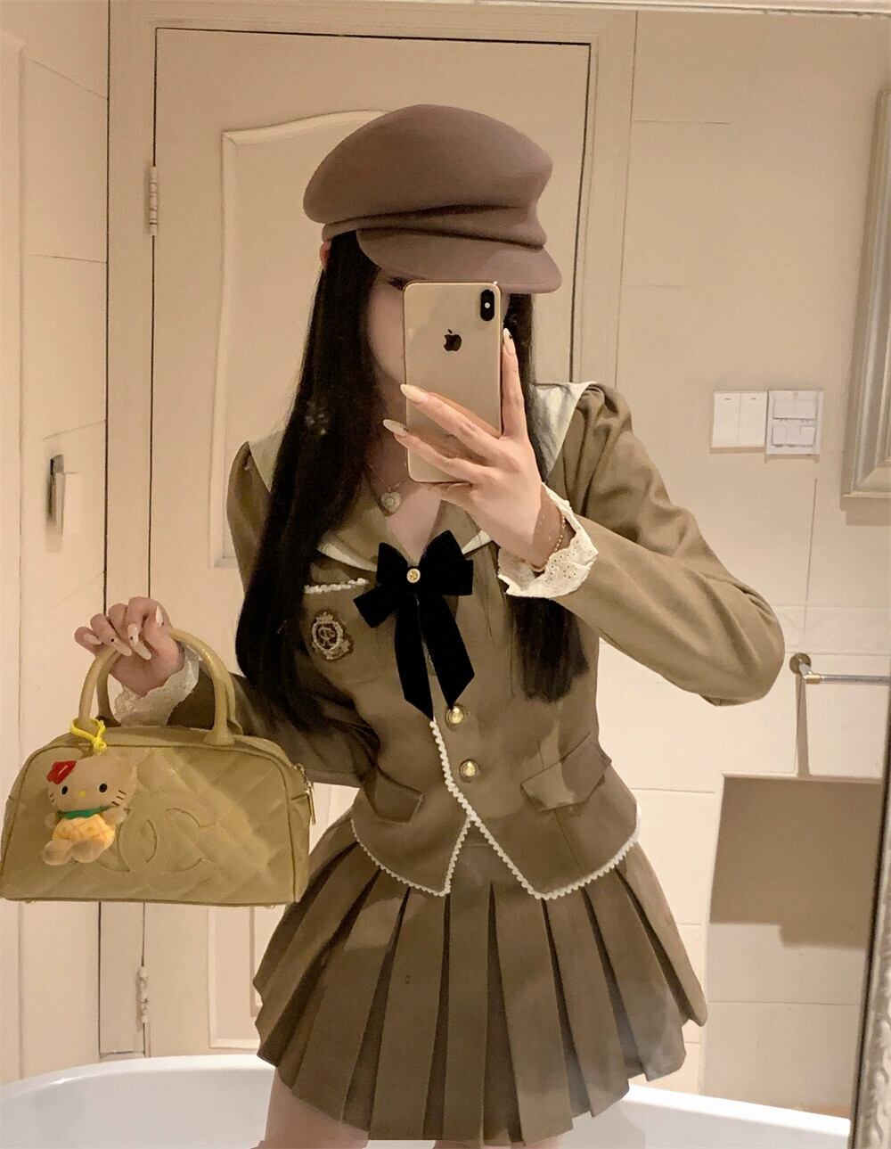 大学スタイルの年齢を軽減する気質ブレザー、蝶ネクタイと純粋な欲望のハイウエストのプリーツスカートスーツ秋の女性 リボン オータム 秋物 ピュア nana70988944465 | modepoisson