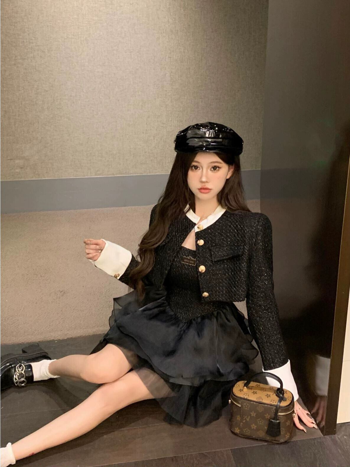 ナナ〜Xiaoxiangfengドレス女性の秋のツーピースセット甘くてクールなスタイルの裕福な娘の黒のふわふわプリンセスドレス ブラック 大人ガーリー スウィート キュート カジュアル オータム 秋物 nana51960971346