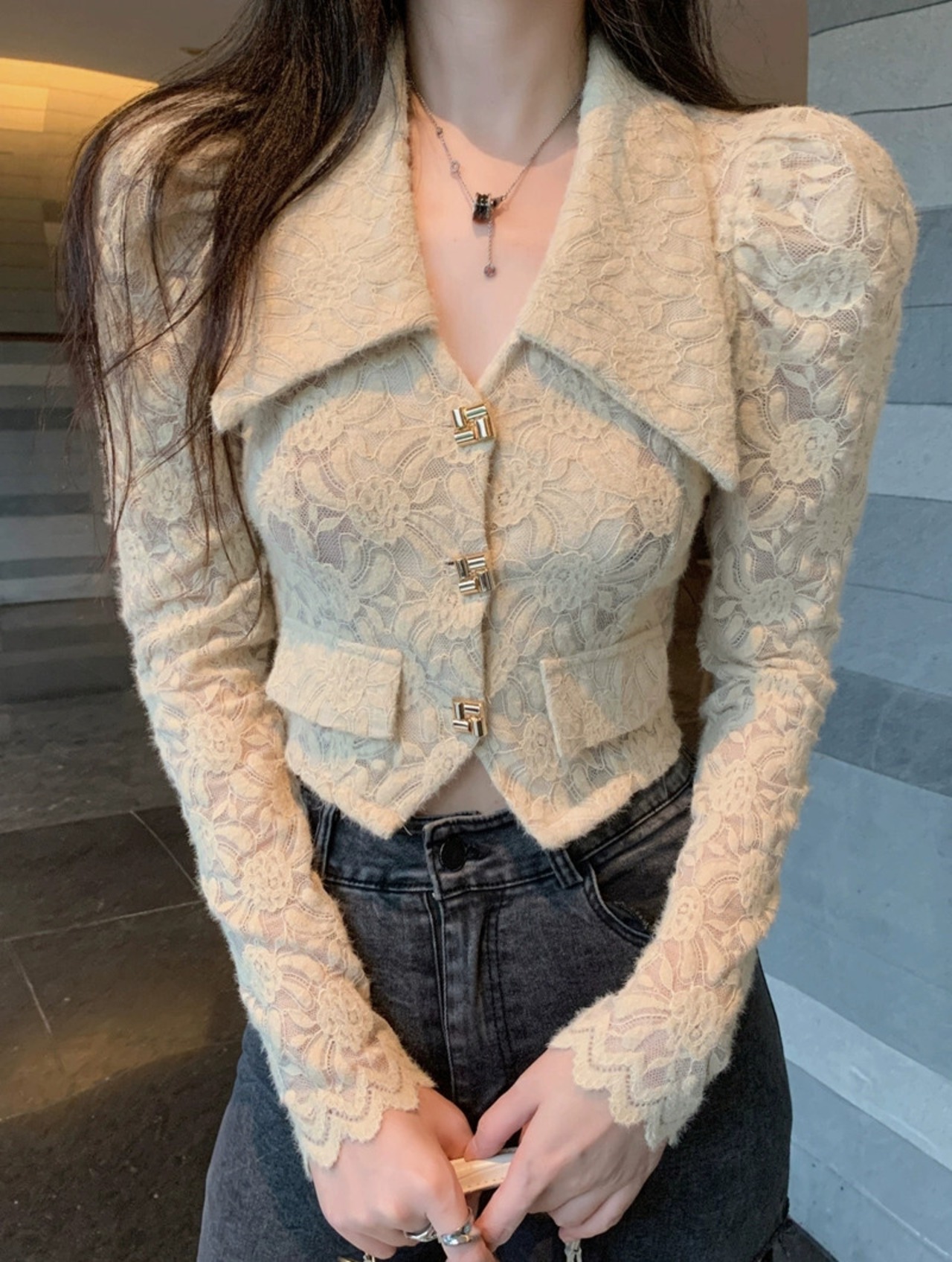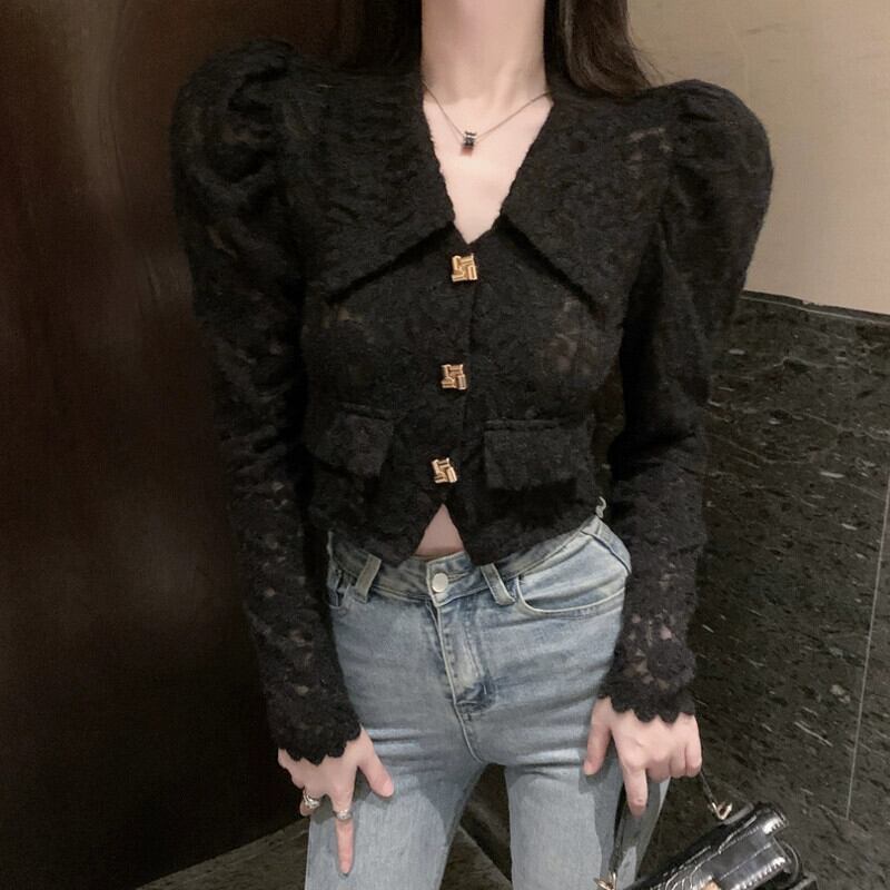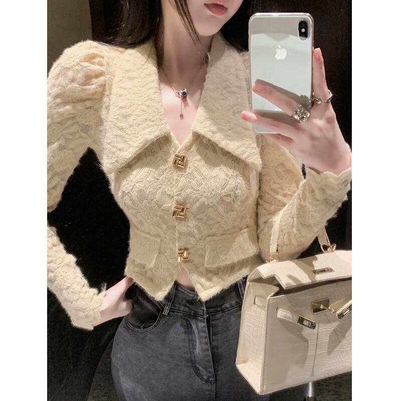 フランスのファッショナブルで年齢を軽減するカジュアルなラペルレースシャツの女性の秋の長袖シングルブレストパフスリーブ多用途トップ ロング オータム 秋物 nana43403264802 | modepoisson