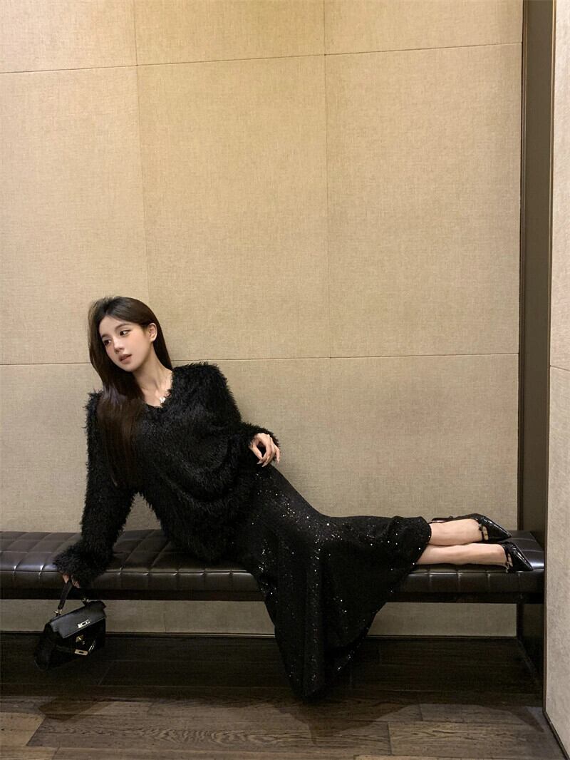 フランスの成熟した姉妹スタイルのルーズ毛皮のようなプルオーバートップ + ハイウエストスパンコールフィッシュテールスカートツーピーススーツ女性の冬 ハイウェスト ウィンター 冬物 nana52534955020 | modepoisson