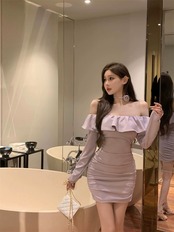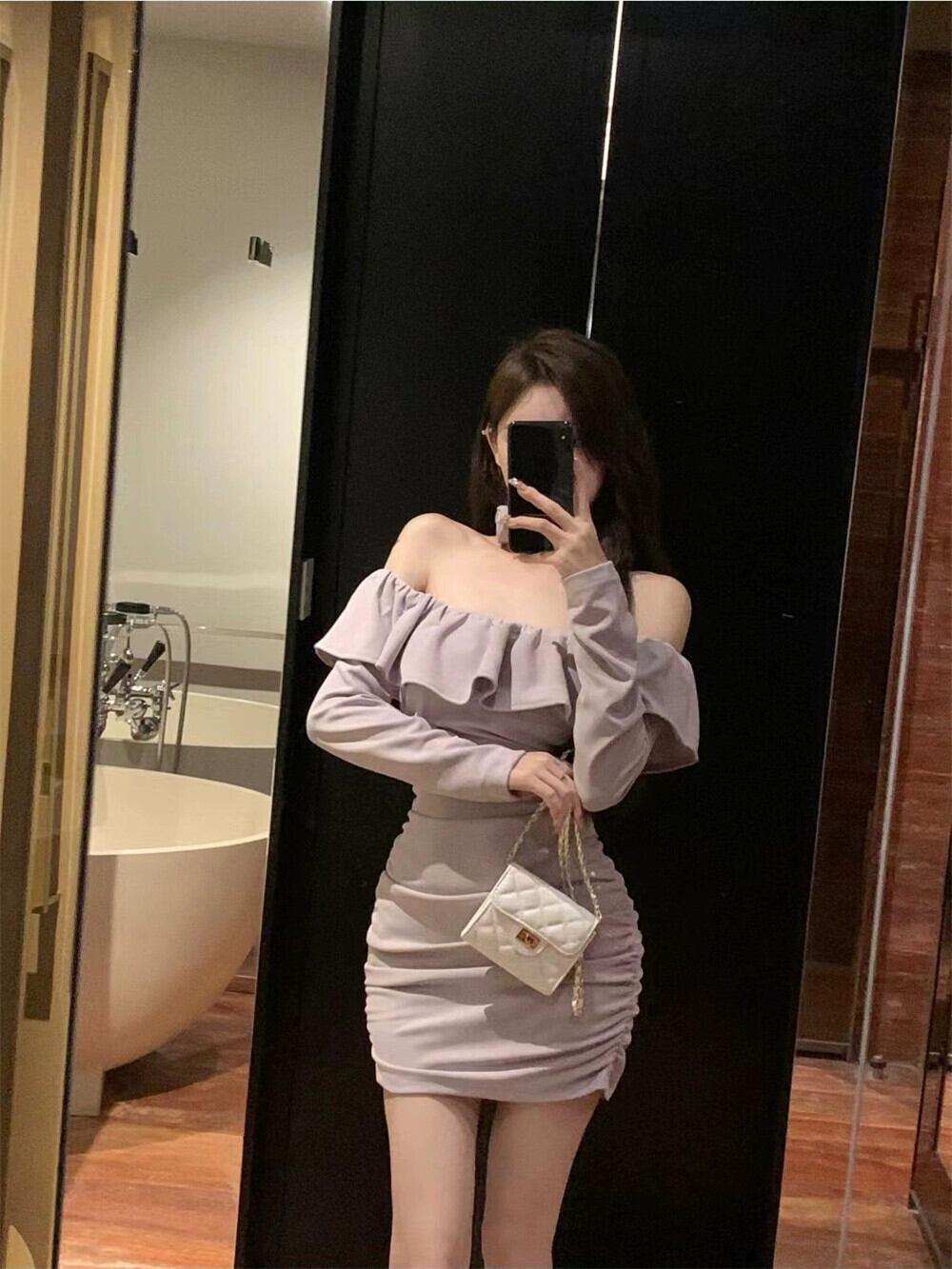 フランスの軽くて大人のスタイル、甘くて年齢を軽減するワンショルダーフリル長袖ハイウエストスリムプリーツお尻カバードレス秋の女性 ロング 大人ガーリー スウィート キュート カジュアル オータム 秋物 nana52883291028 | modepoisson