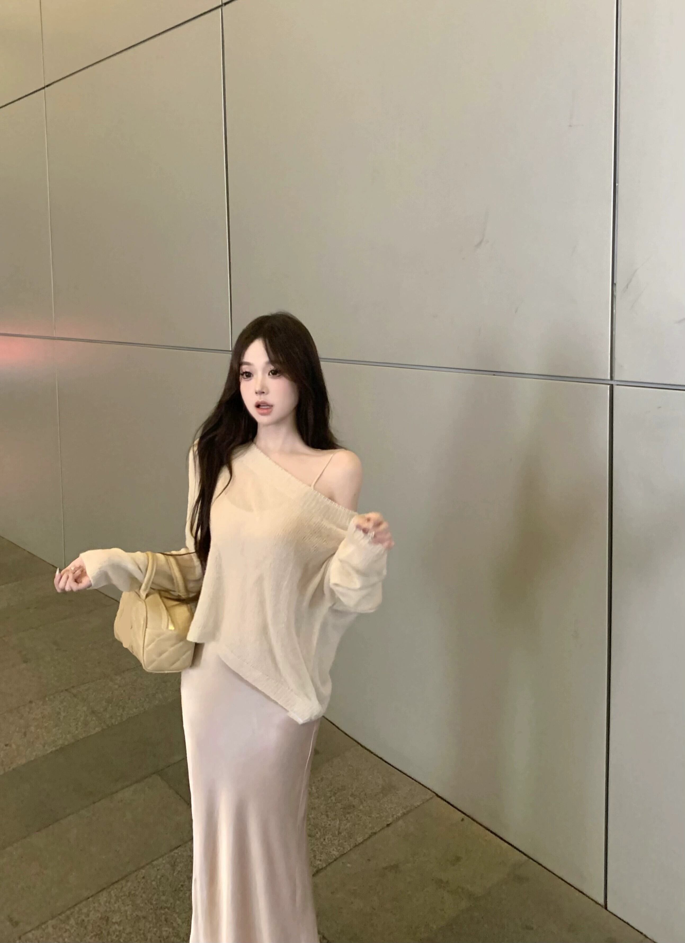 Oxygen Beauty 優しい秋と冬のセーターブラウスサテンサスペンダードレスハイエンドの気質 2 点セット女性 オータム 秋物 ウィンター 冬物 nana94504994508 | modepoisson