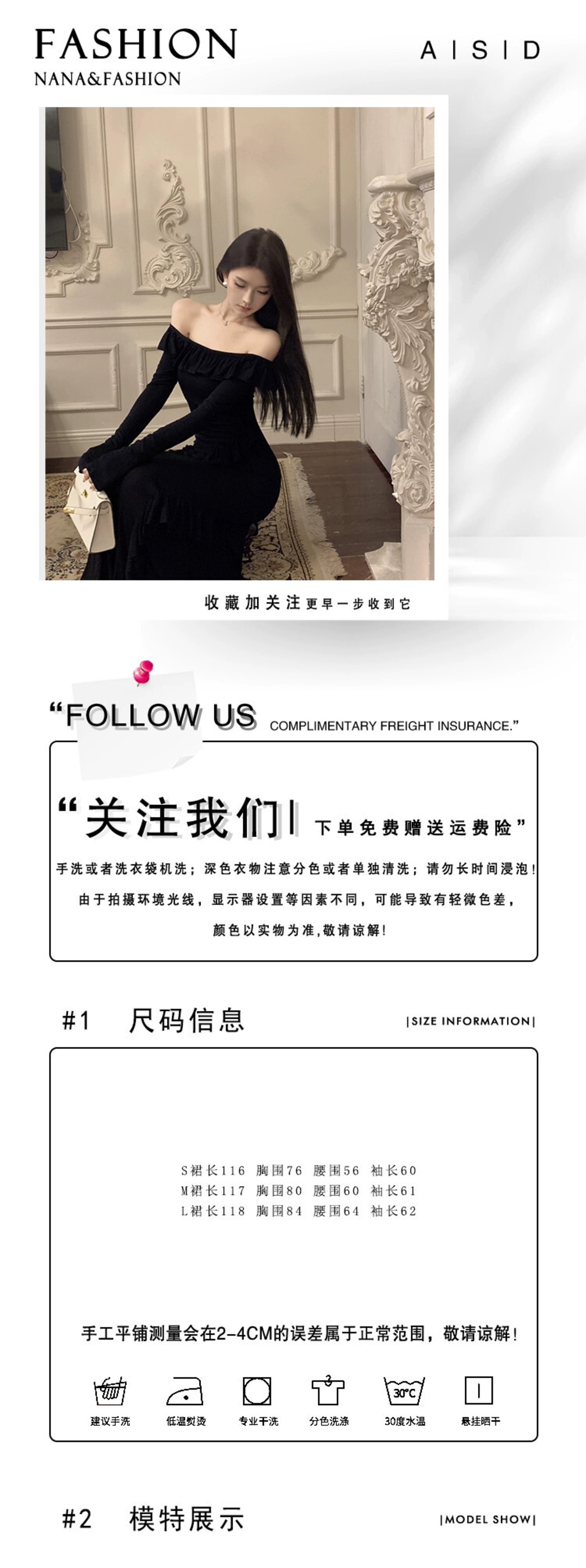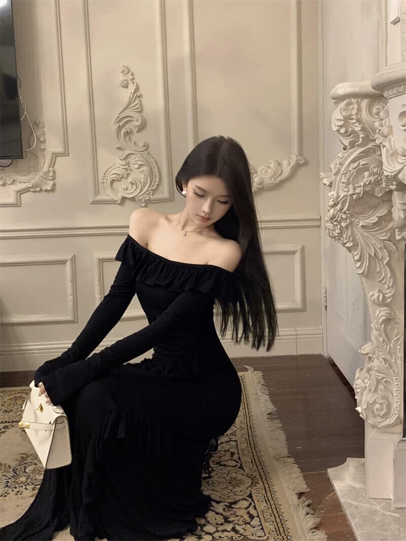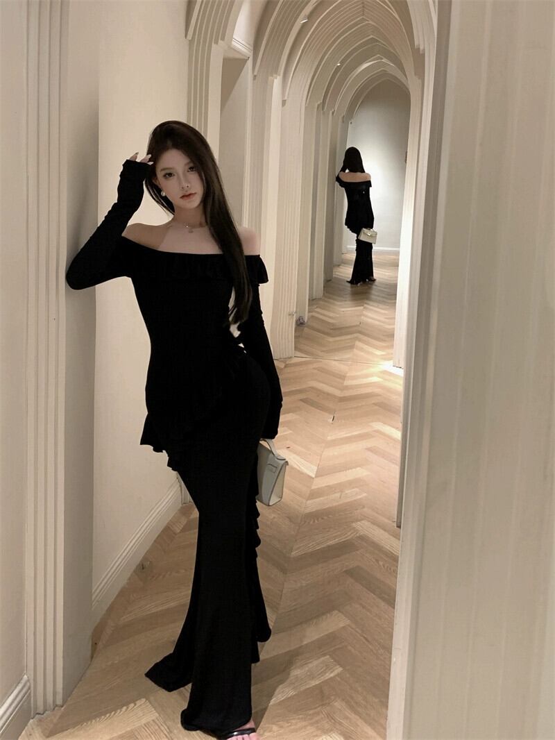 イヤリング付きの黒いフレンチスタイルのドレス、スリムなウエストと初秋の気質の女性、スリムなスリット、長袖スカート、ロングスカート ブラック オータム 秋物 指輪 nana59071405993 | modepoisson