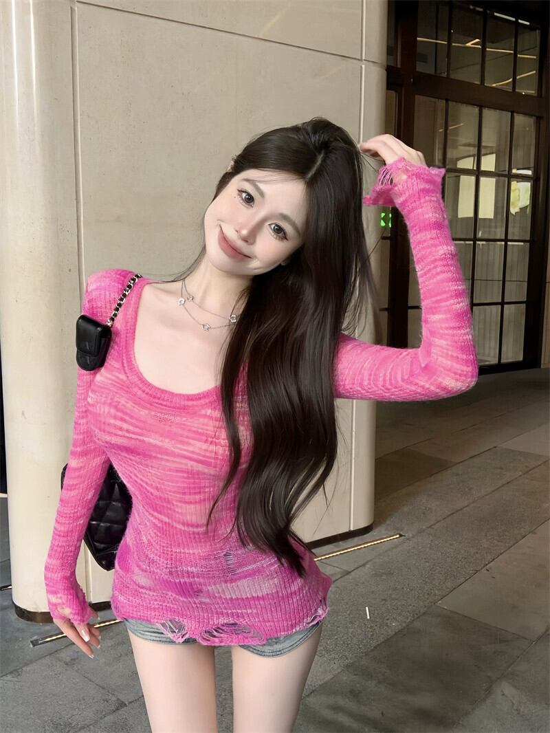 フランスのホットガール純粋な欲望多用途ビッグ U ネック絞り染め穴あきミッドレングススリムタイトセーターニットウェア女性秋 オータム 秋物 ピュア nana98686546309 | modepoisson