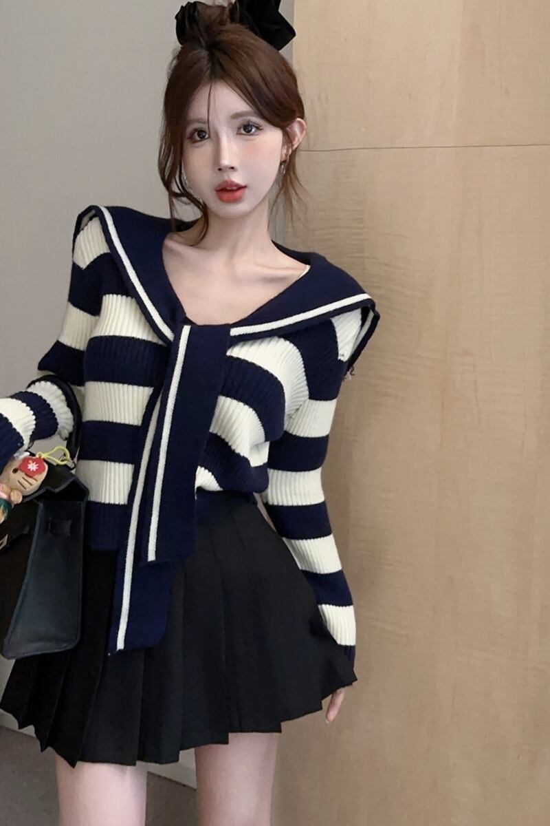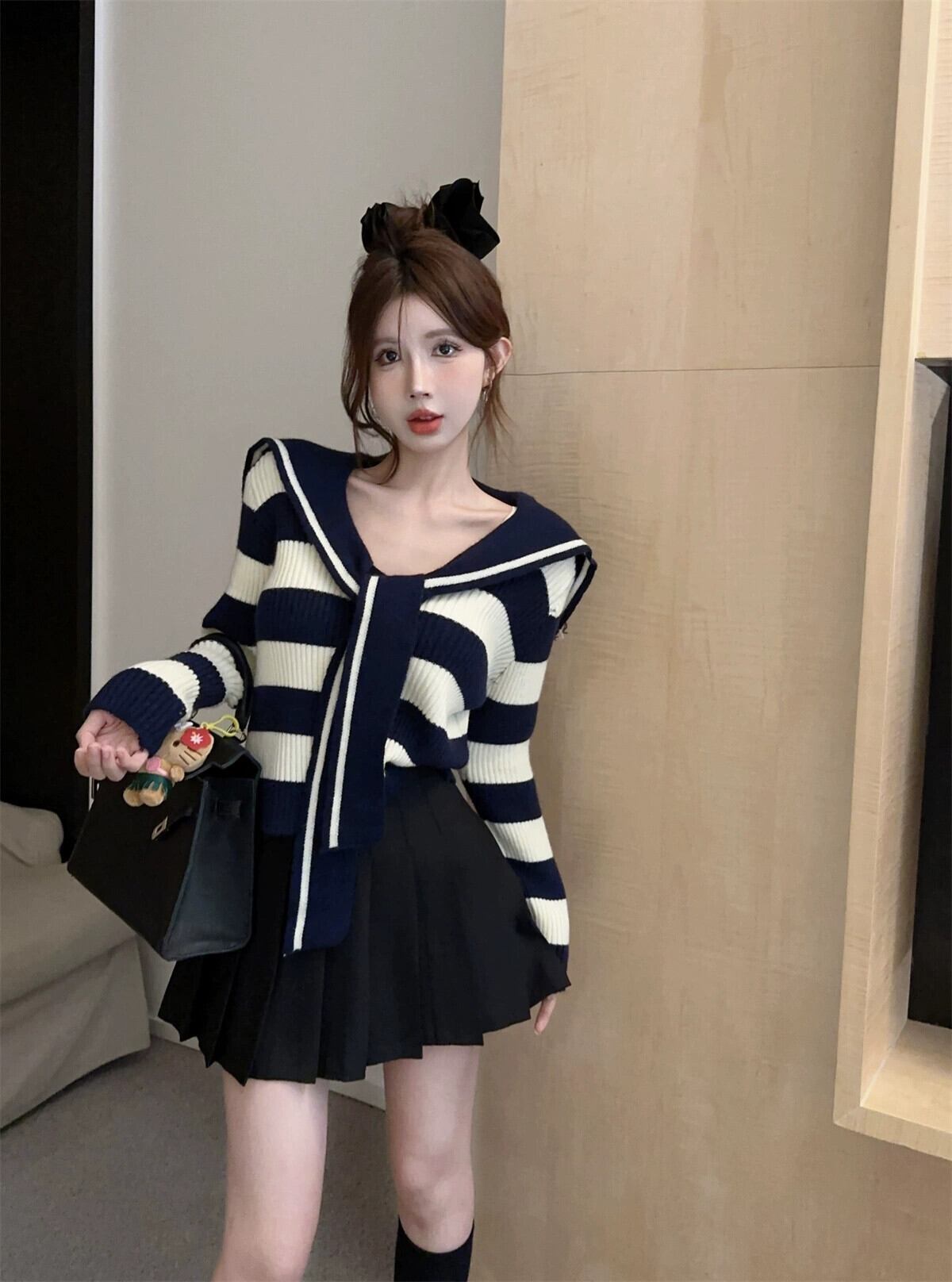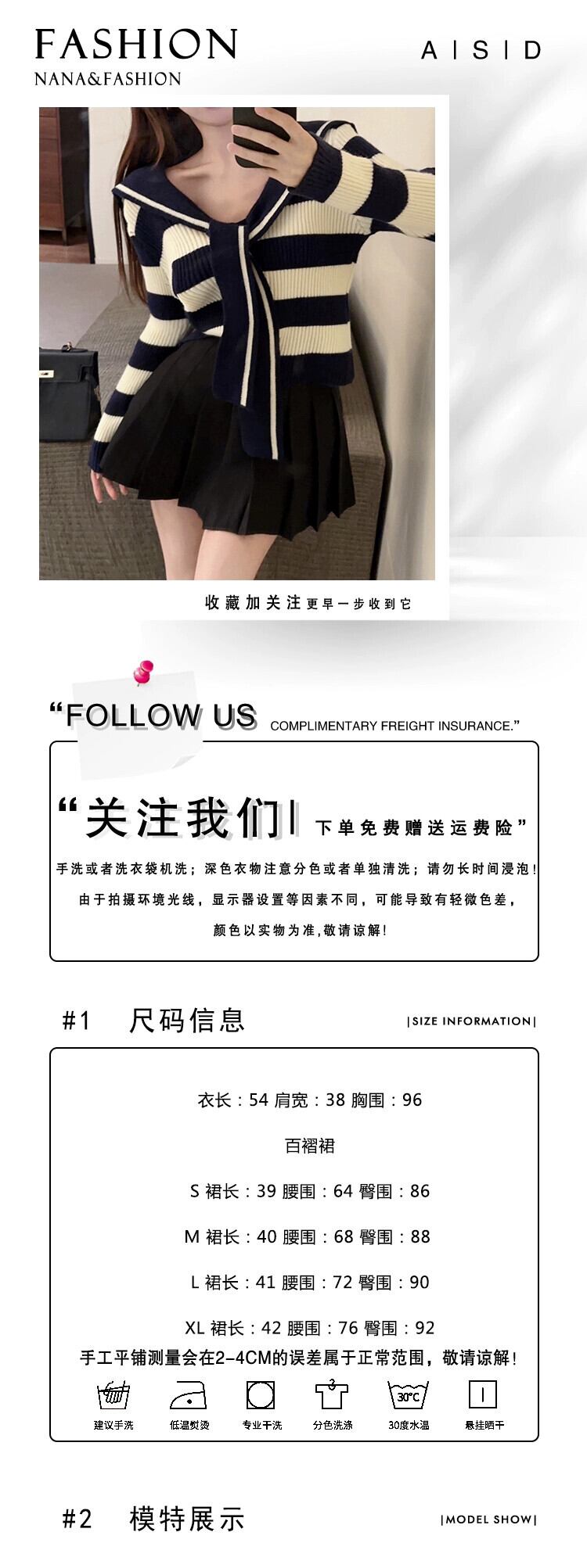 スタイルカレッジネイビーカラーストライププルオーバーニットセーター女性ハイウエスト多用途プリーツスカートハイエンドツーピーススーツ ハイウェスト nana871231066 | modepoisson