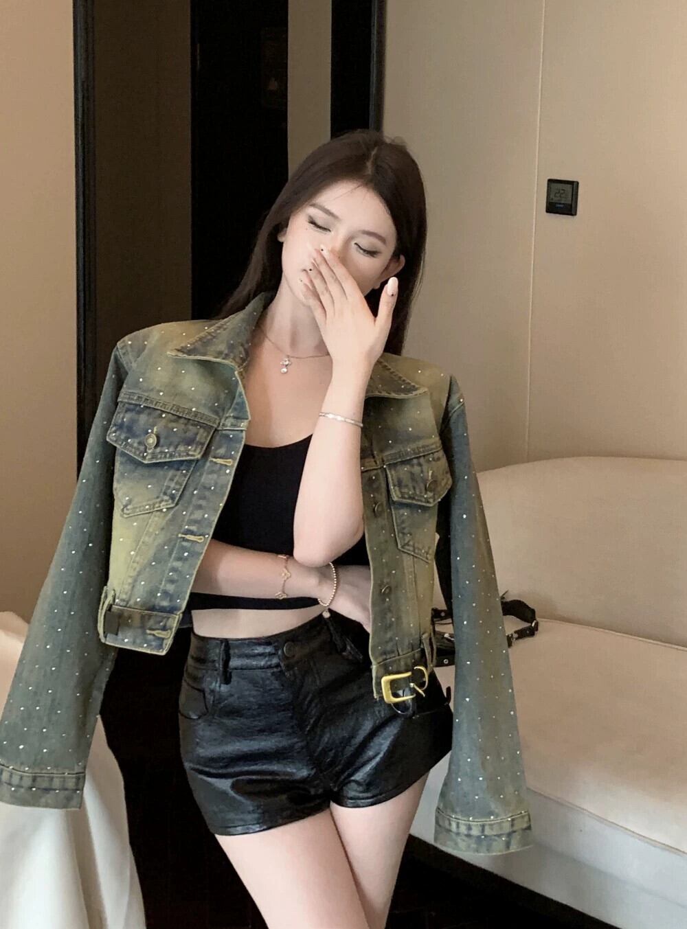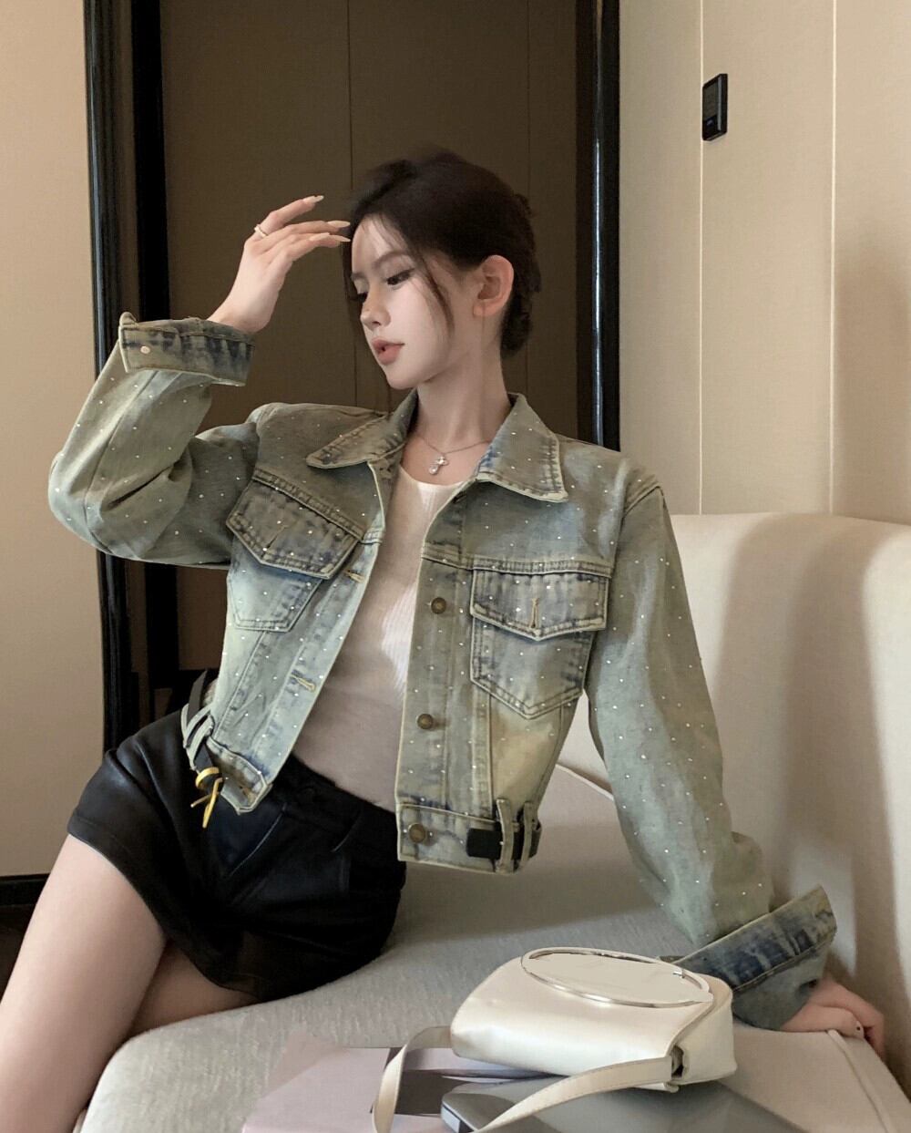 Hot Girl ショートジャケット レトロ重工業 ダイヤモンドウォッシュ 長袖 デニム アウター レディース 2023 秋 ロング オータム 秋物 nana52578255276 | modepoisson